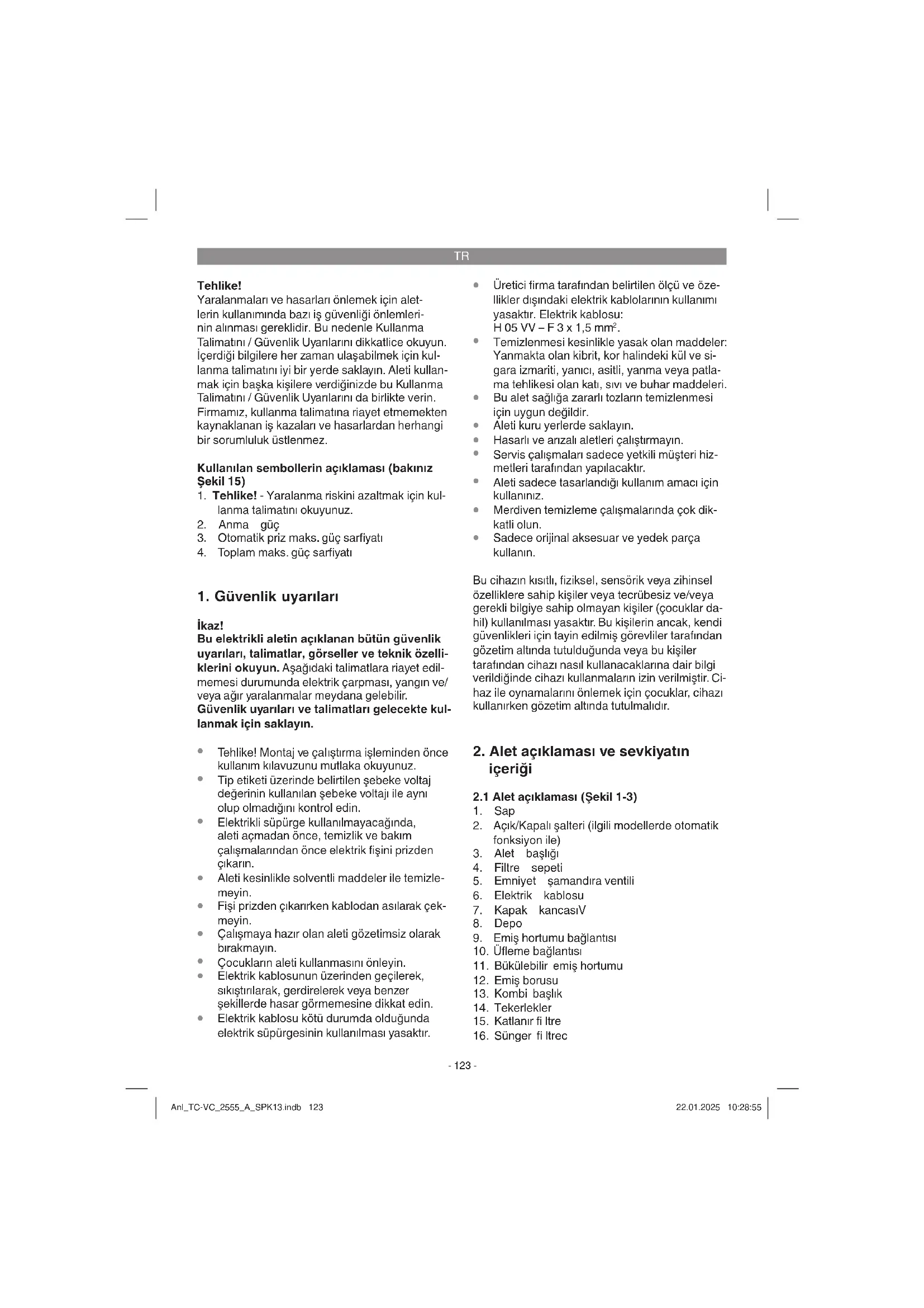 Üretici firma tarafından belirtilen ölçü ve öze- llikler dışındaki elektrik kablolarının kullanımı yasaktır. Elektrik kablosu: H 05 VV – F 3 x 1,5 mm