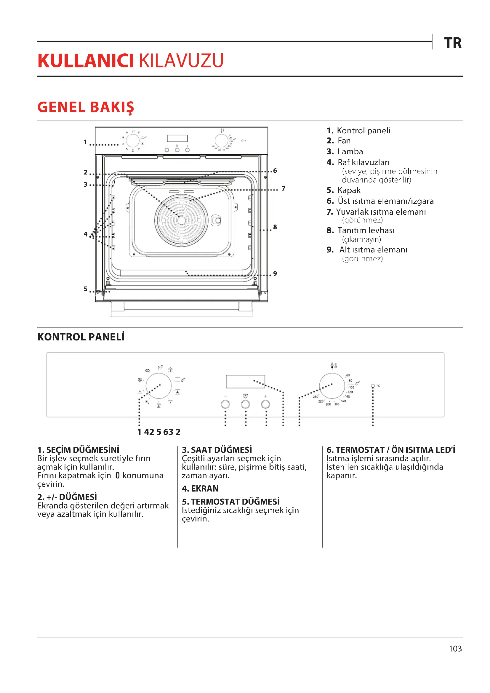 - Pişirme işleminin yarısına gelindiğinde yemeği çevirin ** Pişirme işleminin üçte ikisine gelindiğinde yemeği çevirin (gerekirse). ***Tahmini süre: Kişisel tercihe göre yemekler fırından farklı zamanlarda çıkarılabilir. İŞLEVLER Alt ve Üstten Isıtma Izgara Turbo Izgara Zorunlu Hava Konveksiyonlu EkmekTR