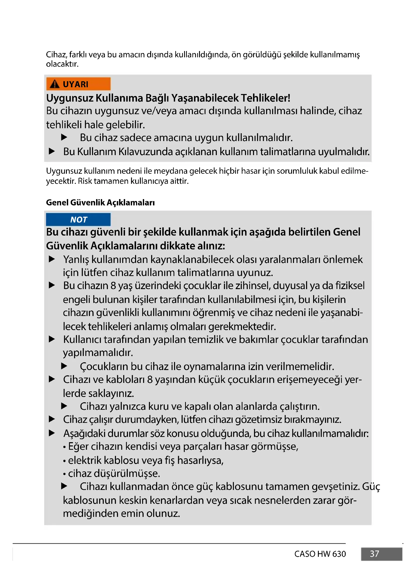 - oda ve kahvaltı yerlernde. TEHLIKE UYARI DIKKAT NOT37 CASO HW 630 Cihaz, farklı veya bu amacın dışında kullanıldığında, ön görüldüğü şekilde kullanılmamış olacaktır. Uygunsuz Kullanıma Bağlı Yaşanabilecek Tehlikeler! Bu cihazın uygunsuz ve/veya amacı dışında kullanılması halinde, cihaz tehlikeli hale gelebilir. f Bu cihaz sadece amacına uygun kullanılmalıdır. f Bu Kullanım Kılavuzunda açıklanan kullanım talimatlarına uyulmalıdır. Uygunsuz kullanım nedeni ile meydana gelecek hiçbir hasar için sorumluluk kabul edilme- yecektir. Risk tamamen kullanıcıya aittir. Genel Güvenlik Açıklamaları NOT Bu cihazı güvenli bir şekilde kullanmak için aşağıda belirtilen Genel Güvenlik Açıklamalarını dikkate alınız: f Yanlış kullanımdan kaynaklanabilecek olası yaralanmaları önlemek için lütfen cihaz kullanım talimatlarına uyunuz. f Bu cihazın 8 yaş üzerindeki çocuklar ile zihinsel, duyusal ya da fiziksel engeli bulunan kişiler tarafından kullanılabilmesi için, bu kişilerin cihazın güvenlikli kullanımını öğrenmiş ve cihaz nedeni ile yaşanabi- lecek tehlikeleri anlamış olmaları gerekmektedir. f Kullanıcı tarafından yapılan temizlik ve bakımlar çocuklar tarafından yapılmamalıdır. f Çocukların bu cihaz ile oynamalarına izin verilmemelidir. f Cihazı ve kabloları 8 yaşından küçük çocukların erişemeyeceği yer- lerde saklayınız. f Cihazı yalnızca kuru ve kapalı olan alanlarda çalıştırın. f Cihaz çalışır durumdayken, lütfen cihazı gözetimsiz bırakmayınız. f Aşağıdaki durumlar söz konusu olduğunda, bu cihaz kullanılmamalıdır: