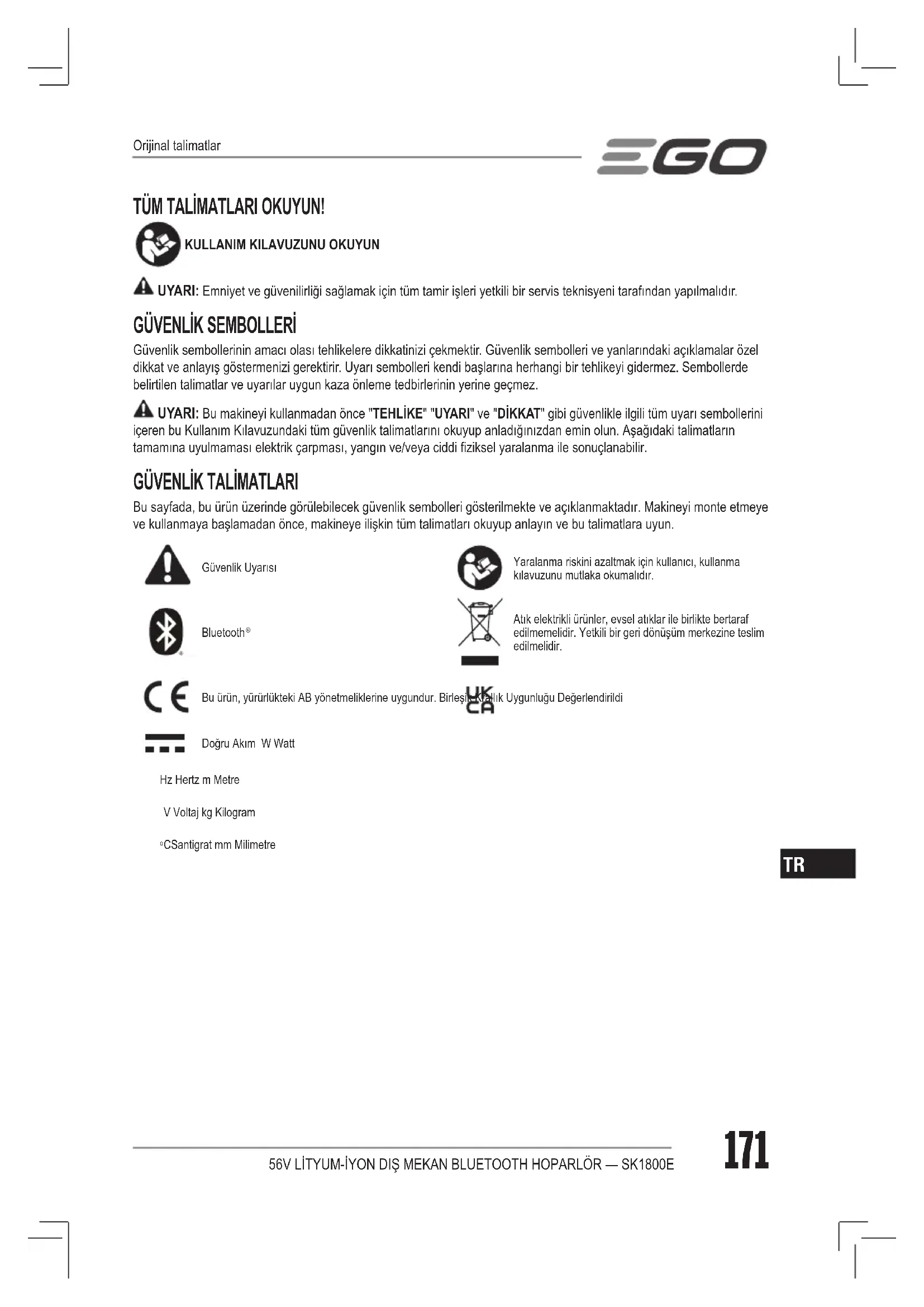 Bu sayfada, bu ürün üzerinde görülebilecek güvenlik sembolleri gösterilmekte ve açıklanmaktadır. Makineyi monte etmeye ve kullanmaya başlamadan önce, makineye ilişkin tüm talimatları okuyup anlayın ve bu talimatlara uyun. Güvenlik UyarısıYaralanma riskini azaltmak için kullanıcı, kullanma kılavuzunu mutlaka okumalıdır.Bluetooth Atık elektrikli ürünler, evsel atıklar ile birlikte bertaraf edilmemelidir. Yetkili bir geri dönüşüm merkezine teslim edilmelidir.Bu ürün, yürürlükteki AB yönetmeliklerine uygundur. Birleşik Krallık Uygunluğu DeğerlendirildiDoğru Akım W Watt Hz Hertz m MetreV Voltaj kg Kilogram C Santigrat mm Milimetre Orijinal talimatlar172