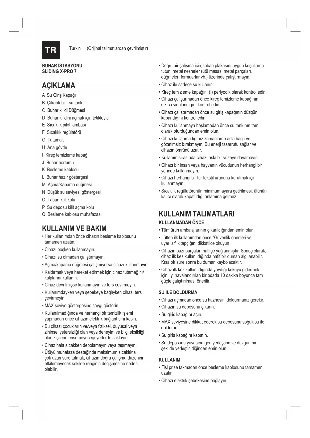 BUHAR İSTASYONU SLIDING X-PRO 7 AÇIKLAMA A Su Giriş Kapağı B Çıkarılabilir su tankı C Buhar kilidi Düğmesi D Buhar kilidini açmak için tetikleyici E Sıcaklık pilot lambası F Sıcaklık regülatörü G Tutamak H Ana gövde I Kireç temizleme kapağı J Buhar hortumu K Besleme kablosu L Buhar hazır göstergesi M Açma/Kapama düğmesi N Düşük su seviyesi göstergesi O Taban kilit kolu P Su deposu kilit açma kolu Q Besleme kablosu muhafazası