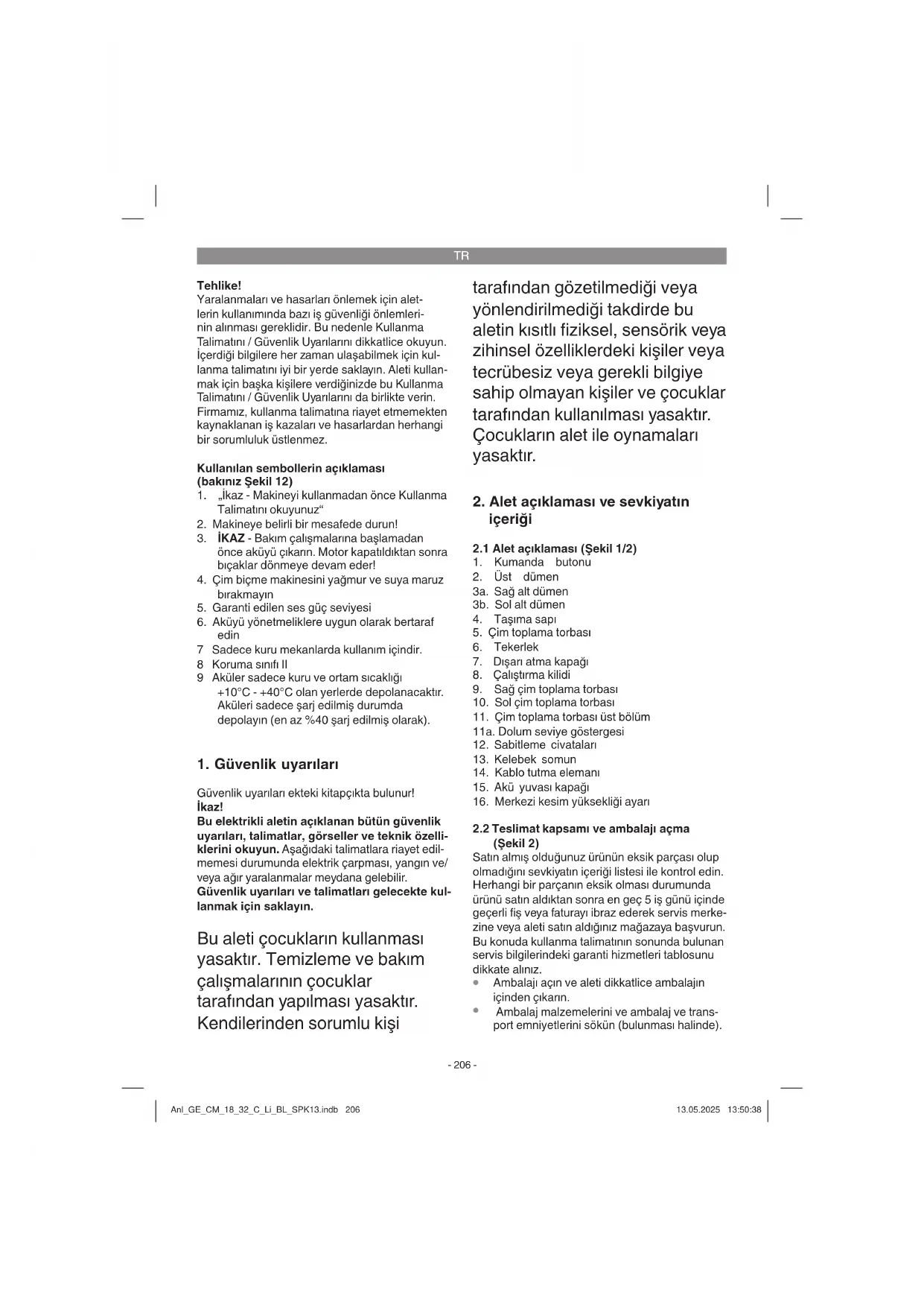 Çim biçme makinesi ile güvenli şekilde çalışabilmeniz için bağlantı elemanlarının (ci- vata, somun, vs.) tümünün daima sıkı şekilde bağlı olmasını sağlayın. Anl_GE_CM_18_32_C_Li_BL_SPK13.indb 210Anl_GE_CM_18_32_C_Li_BL_SPK13.indb 210 13.05.2025 13:50:3913.05.2025 13:50:39TR