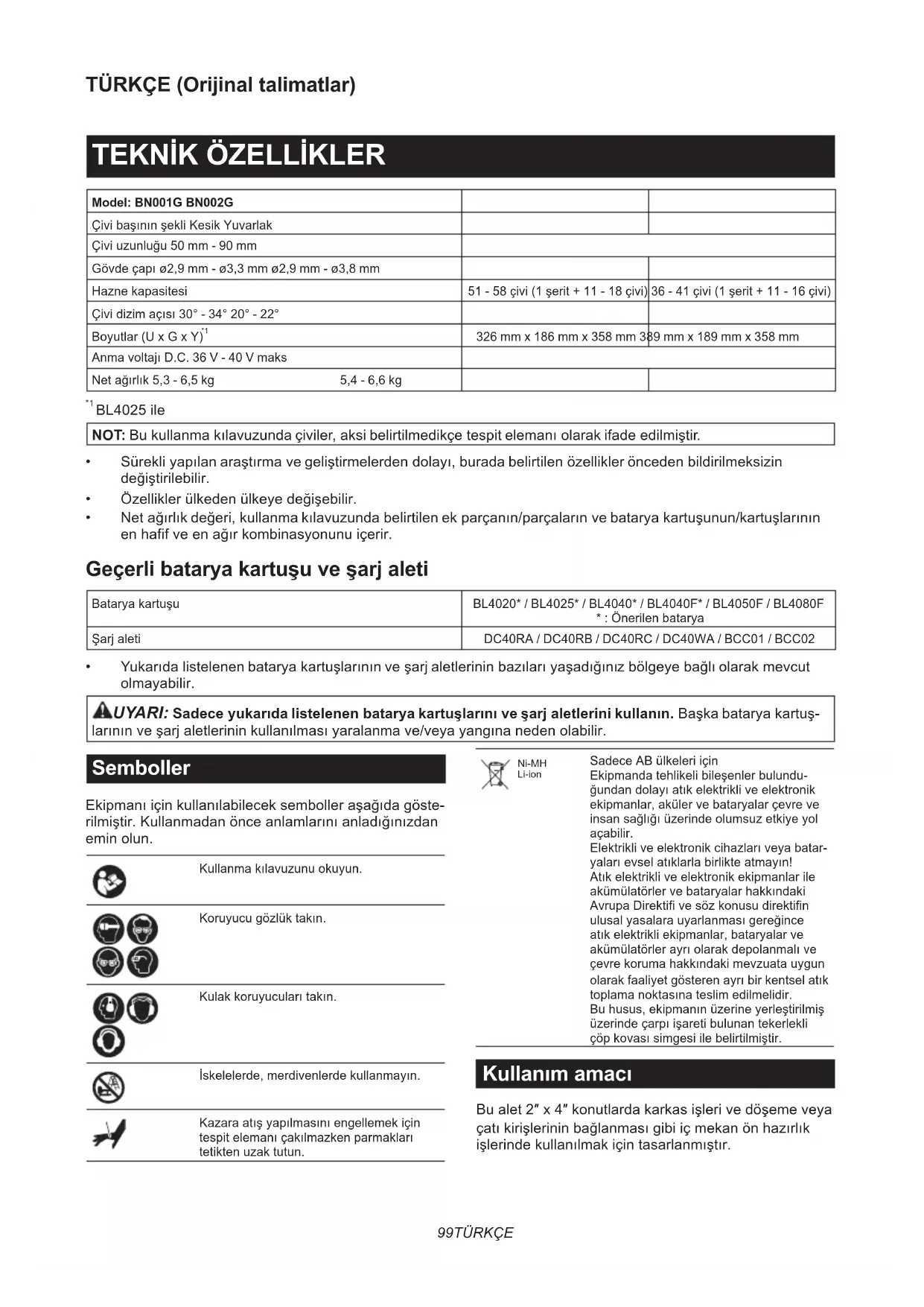 - Yukarıda listelenen batarya kartuşlarının ve şarj aletlerinin bazıları yaşadığınız bölgeye bağlı olarak mevcut olmayabilir. UYARI: Sadece yukarıda listelenen batarya kartuşlarını ve şarj aletlerini kullanın. Başka batarya kartuş- larının ve şarj aletlerinin kullanılması yaralanma ve/veya yangına neden olabilir. Semboller Ekipmanı için kullanılabilecek semboller aşağıda göste- rilmiştir. Kullanmadan önce anlamlarını anladığınızdan emin olun. Kullanma kılavuzunu okuyun. Koruyucu gözlük takın. Kulak koruyucuları takın. İskelelerde, merdivenlerde kullanmayın. Kazara atış yapılmasını engellemek için tespit elemanı çakılmazken parmakları tetikten uzak tutun. Ni-MH Li-ion Sadece AB ülkeleri için Ekipmanda tehlikeli bileşenler bulundu- ğundan dolayı atık elektrikli ve elektronik ekipmanlar, aküler ve bataryalar çevre ve insan sağlığı üzerinde olumsuz etkiye yol açabilir. Elektrikli ve elektronik cihazları veya batar- yaları evsel atıklarla birlikte atmayın! Atık elektrikli ve elektronik ekipmanlar ile akümülatörler ve bataryalar hakkındaki Avrupa Direktifi ve söz konusu direktifin ulusal yasalara uyarlanması gereğince atık elektrikli ekipmanlar, bataryalar ve akümülatörler ayrı olarak depolanmalı ve çevre koruma hakkındaki mevzuata uygun olarak faaliyet gösteren ayrı bir kentsel atık toplama noktasına teslim edilmelidir. Bu husus, ekipmanın üzerine yerleştirilmiş üzerinde çarpı işareti bulunan tekerlekli çöp kovası simgesi ile belirtilmiştir. Kullanım amacı Bu alet 2″ x 4″ konutlarda karkas işleri ve döşeme veya çatı kirişlerinin bağlanması gibi iç mekan ön hazırlık işlerinde kullanılmak için tasarlanmıştır.100 TÜRKÇE Gürültü Tipik A-ağırlıklı gürültü düzeyi (EN60745-2-16 standar- dına göre belirlenen): Model BN001G Ses basınç seviyesi (L