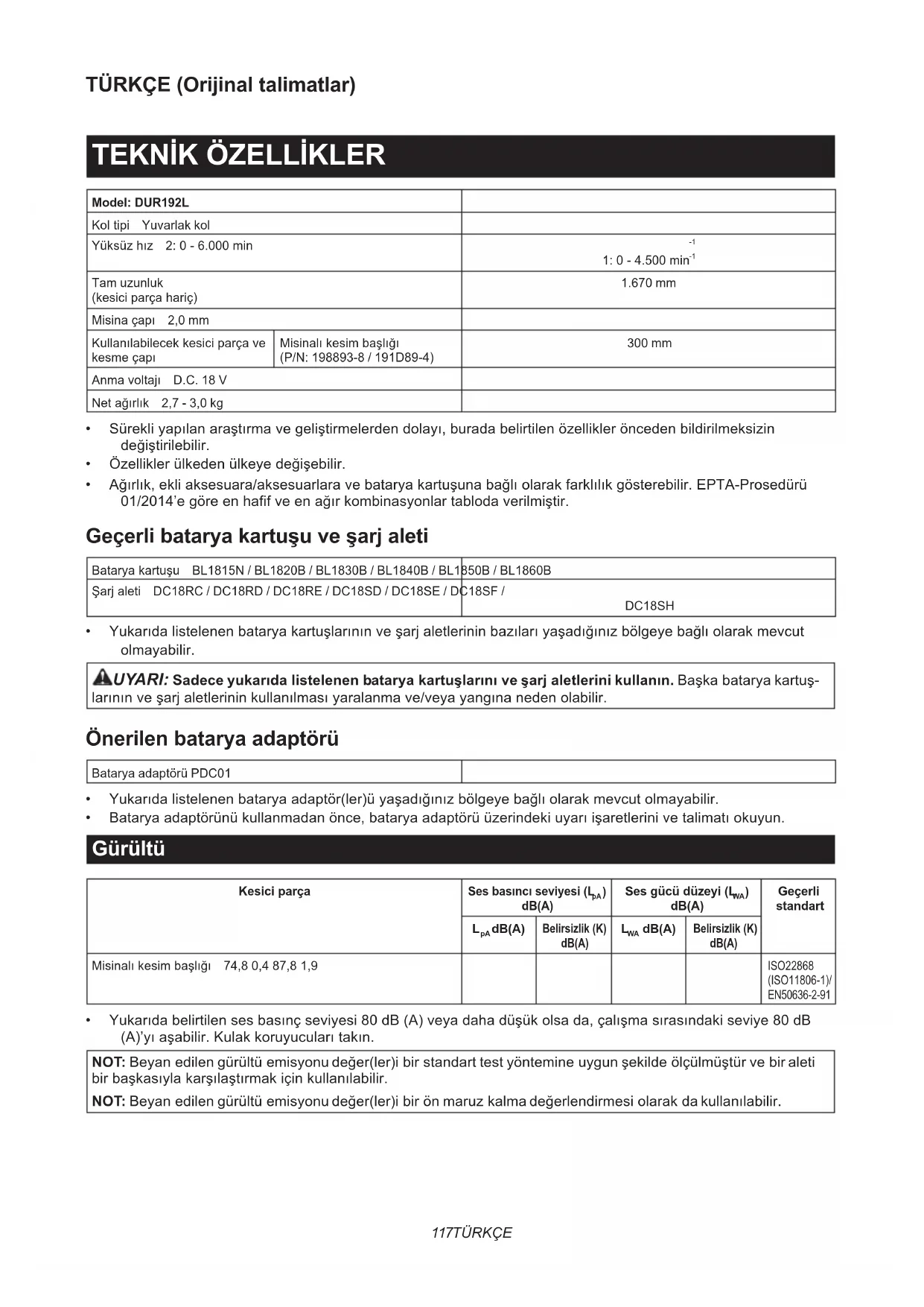 - Ağırlık,ekliaksesuara/aksesuarlaravebataryakartuşunabağlıolarakfarklılıkgösterebilir.EPTA-Prosedürü 01/2014’egöreenhafifveenağırkombinasyonlartablodaverilmiştir. Geçerli batarya kartuşu ve şarj aleti Bataryakartuşu BL1815N / BL1820B / BL1830B / BL1840B / BL1850B / BL1860B Şarjaleti DC18RC / DC18RD / DC18RE / DC18SD / DC18SE / DC18SF / DC18SH