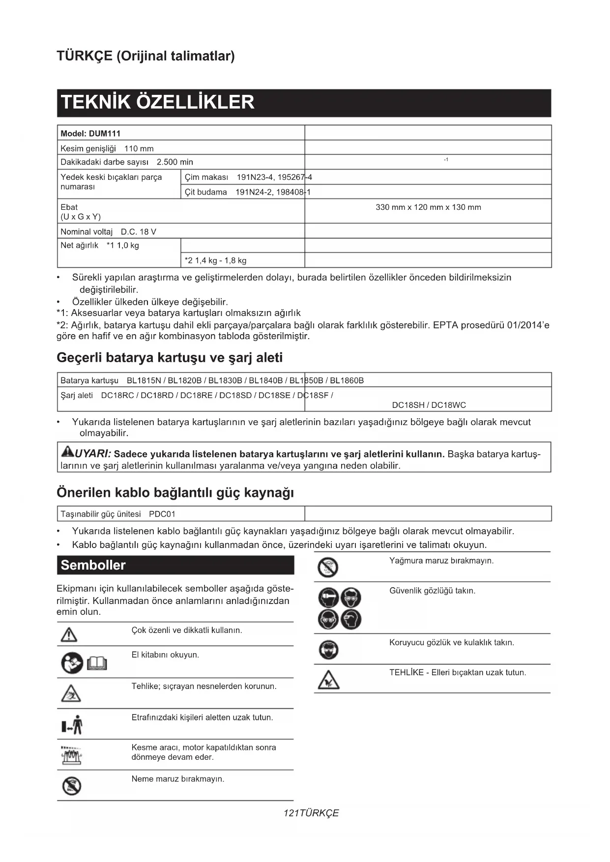 - Kablobağlantılıgüçkaynağınıkullanmadanönce,üzerindekiuyarıişaretlerinivetalimatıokuyun. Semboller Ekipmanıiçinkullanılabileceksembolleraşağıdagöste- rilmiştir.Kullanmadanönceanlamlarınıanladığınızdan eminolun. Çoközenlivedikkatlikullanın. Elkitabınıokuyun. Tehlike;sıçrayannesnelerdenkorunun. Etrafınızdakikişilerialettenuzaktutun. Kesmearacı,motorkapatıldıktansonra dönmeyedevameder. Nememaruzbırakmayın. Yağmuramaruzbırakmayın. Güvenlikgözlüğütakın. Koruyucugözlükvekulaklıktakın. TEHLİKE-Elleribıçaktanuzaktutun.122 TÜRKÇE Ni-MH Li-ion SadeceABülkeleriiçin Ekipmandatehlikelibileşenlerbulundu- ğundandolayıatıkelektrikliveelektronik ekipmanlar,akülervebataryalarçevreve insansağlığıüzerindeolumsuzetkiyeyol açabilir. Elektrikliveelektronikcihazlarıveyabatar- yalarıevselatıklarlabirlikteatmayın! Atıkelektrikliveelektronikekipmanlarile akümülatörlervebataryalarhakkındaki AvrupaDirektifivesözkonusudirektifin ulusalyasalarauyarlanmasıgereğince atıkelektrikliekipmanlar,bataryalarve akümülatörlerayrıolarakdepolanmalıve çevrekorumahakkındakimevzuatauygun olarakfaaliyetgösterenayrıbirkentselatık toplamanoktasınateslimedilmelidir. Buhusus,ekipmanınüzerineyerleştirilmiş üzerindeçarpıişaretibulunantekerlekli çöpkovasısimgesiilebelirtilmiştir. ABDışMekanGürültüDirektifiuyarınca garantiedilensesgücüseviyesi. AvustralyaNSWGürültüKontrolMevzuatı uyarıncasesgücüseviyesi Kullanım amacı Bualetçimalanlarınkenarlarınıvesürgünlerikesmek içintasarlanmıştır. Gürültü TipikA-ağırlıklıgürültüdüzeyi(EN62841-4-5standardınagörebelirlenen): DUM111 (çim makası için keski bıçağı takılı halde) Ses basıncı seviyesi
