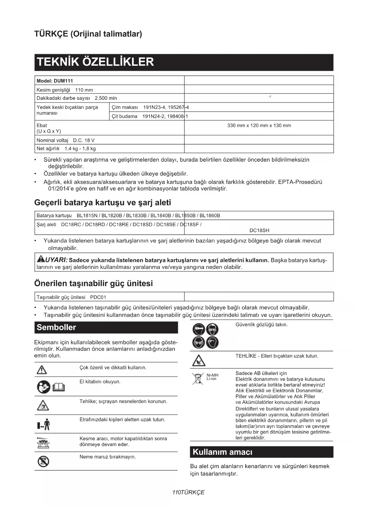 - Taşınabilirgüçünitesinikullanmadanöncetaşınabilirgüçünitesiüzerindekitalimatıveuyarıişaretleriniokuyun. Semboller Ekipmanıiçinkullanılabileceksembolleraşağıdagöste- rilmiştir.Kullanmadanönceanlamlarınıanladığınızdan eminolun. Çoközenlivedikkatlikullanın. Elkitabınıokuyun. Tehlike;sıçrayannesnelerdenkorunun. Etrafınızdakikişilerialettenuzaktutun. Kesmearacı,motorkapatıldıktansonra dönmeyedevameder. Nememaruzbırakmayın. Güvenlikgözlüğütakın. TEHLİKE-Elleribıçaktanuzaktutun. Ni-MH Li-ion SadeceABülkeleriiçin Elektrikdonanımınıvebataryakutusunu evselatıklarlabirliktebertarafetmeyiniz! AtıkElektrikliveElektronikDonanımlar, PillerveAkümülatörlerveAtıkPiller veAkümülatörlerkonusundakiAvrupa Direktierivebunlarınulusalyasalara uygulanmalarıuyarınca,kullanımömürleri bitenelektriklidonanımların,pillerinvepil takım(lar)ınınayrıtoplanmalarıveçevreye uyumlubirgeridönüşümtesisinegetirilme- lerigereklidir. Kullanım amacı Bualetçimalanlarınkenarlarınıvesürgünlerikesmek içintasarlanmıştır.111 TÜRKÇE Gürültü TipikA-ağırlıklıgürültüdüzeyi(EN50636-2-94standar- dınagörebelirlenen): DUM111 (çim makası için keski bıçağı takılı halde) Sesbasınçseviyesi(L