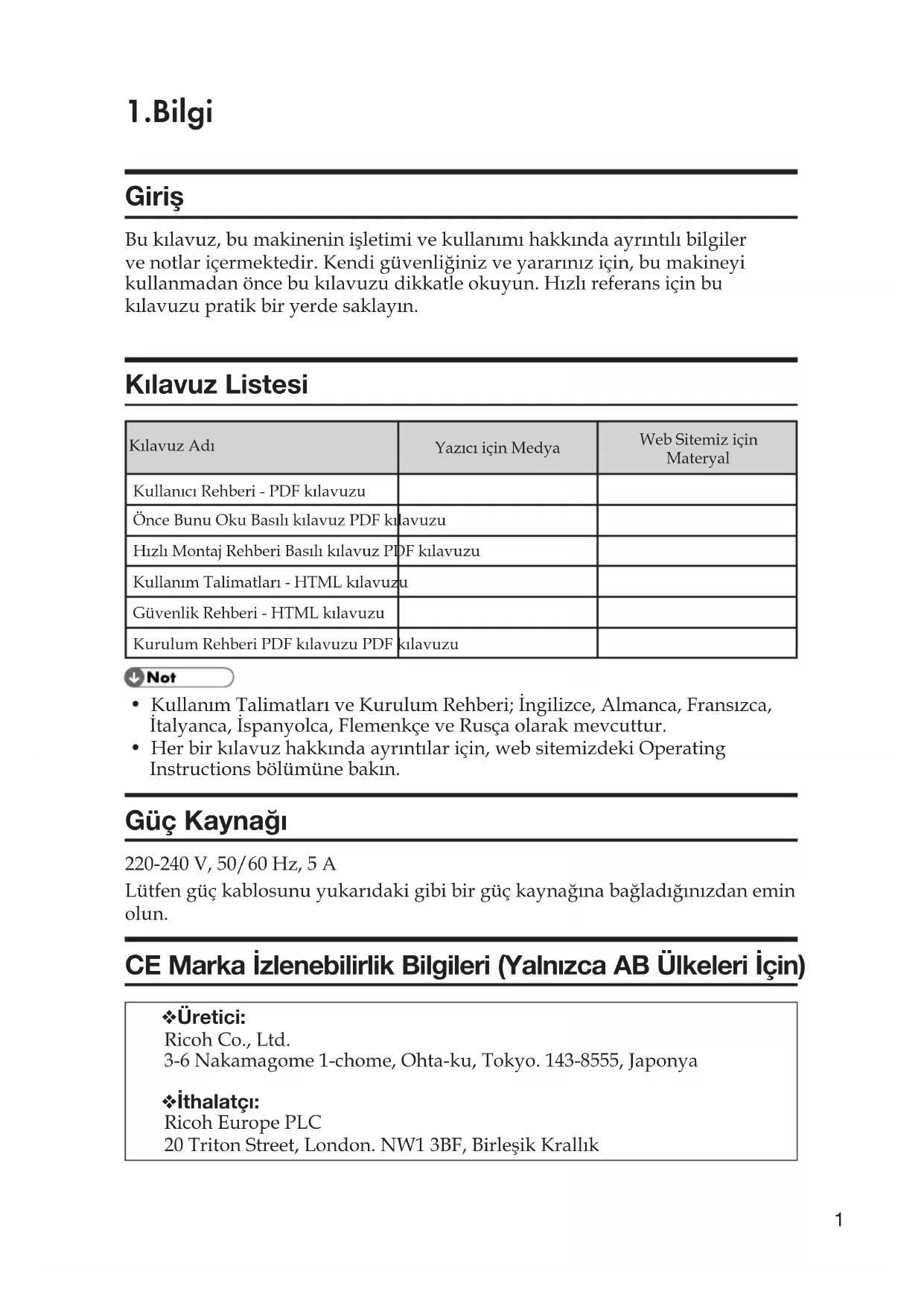 Önce Bunu Oku TürkçeTürkçe1 1.Bilgi Giriş Bu kılavuz, bu makinenin işletimi ve kullanımı hakkında ayrıntılı bilgiler ve notlar içermektedir. Kendi güvenliğiniz ve yararınız için, bu makineyi kullanmadan önce bu kılavuzu dikkatle okuyun. Hızlı referans için bu kılavuzu pratik bir yerde saklayın. Kılavuz Listesi Kılavuz AdıYazıcı için MedyaWeb Sitemiz için MateryalKullanıcı Rehberi - PDF kılavuzuÖnce Bunu Oku Basılı kılavuz PDF kılavuzuHızlı Montaj Rehberi Basılı kılavuz PDF kılavuzuKullanım Talimatları - HTML kılavuzuGüvenlik Rehberi - HTML kılavuzuKurulum Rehberi PDF kılavuzu PDF kılavuzu