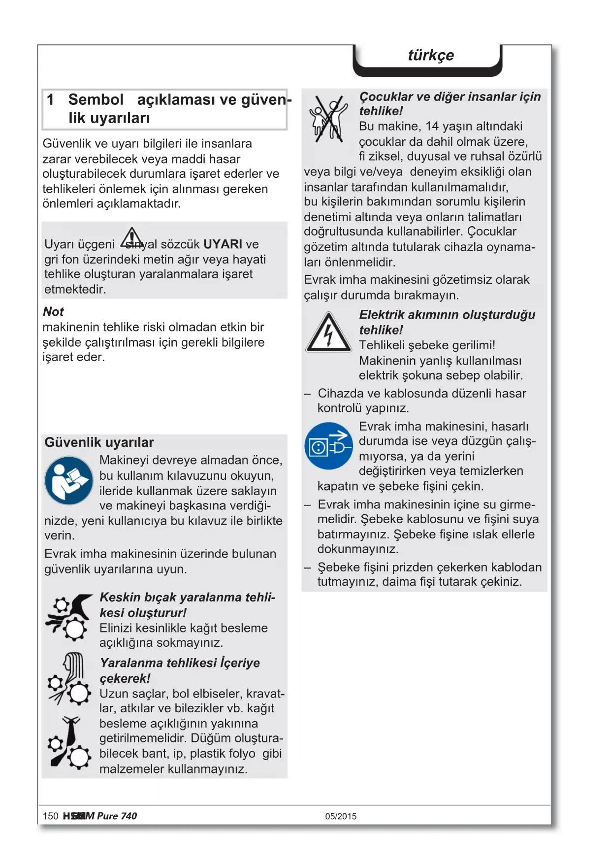 Βάρος 50 kg 56 kg Ταχύτητα κοπής 70 mm/s 60 mm/s Πλάτος εργασίας 400 mm Σύνδεση 230 V, 50 Hz 120 V, 60 Hz 220 V, 60 Hz Μέγιστη ισχύς για μέγιστο αριθμό φύλλων 590 W Τρόπος λειτουργίας Συνεχής λειτουργία Συνθήκες περιβάλλοντος σε λειτουργία: Θερμοκρασία Σχετική υγρασία Υψόμετρο (NN) -10 °C έως +25 °C max. 90 %, χωρίς συμπύκνωση max. 2.000 m Διαστάσεις ΠxΥxΒ (mm) 620 x 487 x 889 Όγκος του δοχείου συλλογής 145 l Εκπομπή θορύβου (λειτουργία χωρίς φορτίο / Υπό φορτίο) 56 dB(A) / 59-63 dB(A)150 HSM Pure 740 05/2015 türkçe 1 Sembol açıklaması ve güven- lik uyarıları Güvenlik ve uyarı bilgileri ile insanlara zarar verebilecek veya maddi hasar oluşturabilecek durumlara işaret ederler ve tehlikeleri önlemek için alınması gereken önlemleri açıklamaktadır. Not makinenin tehlike riski olmadan etkin bir şekilde çalıştırılması için gerekli bilgilere işaret eder. Uyarı üçgeni sinyal sözcük UYARI ve gri fon üzerindeki metin ağır veya hayati tehlike oluşturan yaralanmalara işaret etmektedir. Güvenlik uyarılar Makineyi devreye almadan önce, bu kullanım kılavuzunu okuyun, ileride kullanmak üzere saklayın ve makineyi başkasına verdiği- nizde, yeni kullanıcıya bu kılavuz ile birlikte verin. Evrak imha makinesinin üzerinde bulunan güvenlik uyarılarına uyun. Keskin bıçak yaralanma tehli- kesi oluşturur! Elinizi kesinlikle kağıt besleme açıklığına sokmayınız. Yaralanma tehlikesi İçeriye çekerek! Uzun saçlar, bol elbiseler, kravat- lar, atkılar ve bilezikler vb. kağıt besleme açıklığının yakınına getirilmemelidir. Düğüm oluştura- bilecek bant, ip, plastik folyo gibi malzemeler kullanmayınız. Çocuklar ve diğer insanlar için tehlike! Bu makine, 14 yaşın altındaki çocuklar da dahil olmak üzere, fi ziksel, duyusal ve ruhsal özürlü veya bilgi ve/veya deneyim eksikliği olan insanlar tarafından kullanılmamalıdır, bu kişilerin bakımından sorumlu kişilerin denetimi altında veya onların talimatları doğrultusunda kullanabilirler. Çocuklar gözetim altında tutularak cihazla oynama- ları önlenmelidir. Evrak imha makinesini gözetimsiz olarak çalışır durumda bırakmayın. Elektrik akımının oluşturduğu tehlike! Tehlikeli şebeke gerilimi! Makinenin yanlış kullanılması elektrik şokuna sebep olabilir. – Cihazda ve kablosunda düzenli hasar kontrolü yapınız. Evrak imha makinesini, hasarlı durumda ise veya düzgün çalış- mıyorsa, ya da yerini