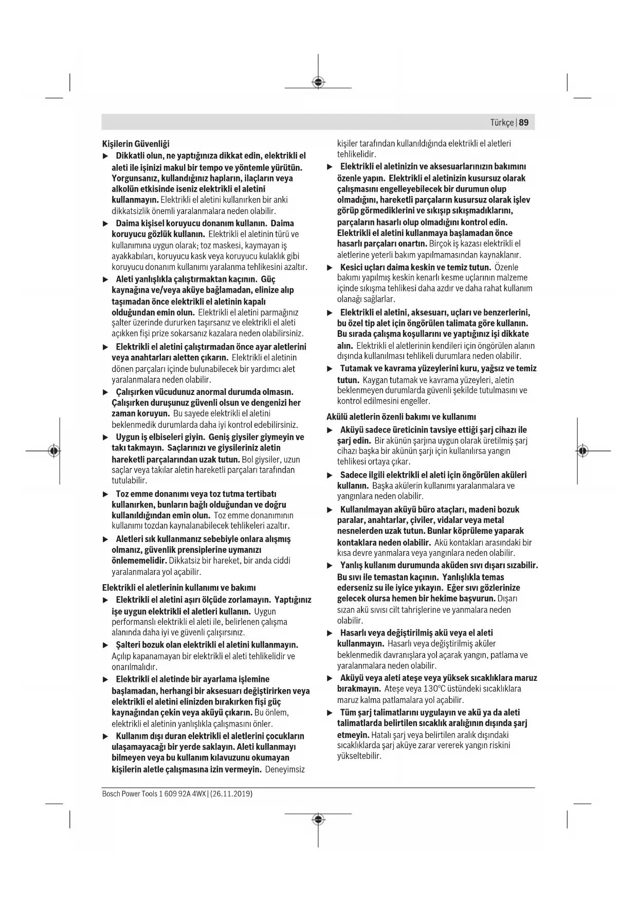 Τα ηλεκτρικά εργαλεία, οι μπαταρίες, τα εξαρτήματα και οι συσκευασίες πρέπει να ανακυκλώνονται με τρόπο φιλικό προς το περιβάλλον. Μην ρίχνετε τα ηλεκτρικά εργαλεία και τις μπαταρίες στα απορρίμματα του σπιτιού σας! Μόνο για χώρες τηςΕΕ: Σύμφωνα με την Ευρωπαϊκή οδηγία 2012/19/ΕΕ τα άχρηστα ηλεκτρικά εργαλεία και σύμφωνα με την Ευρωπαϊκή οδηγία 2006/66/ΕΚ οι χαλασμένες ή χρησιμοποιημένες μπαταρίες πρέπει να συλλέγονται ξεχωριστά για να ανακυκλωθούν με τρόπο φιλικό προς το περιβάλλον. Μπαταρίες/Επαναφορτιζόμενες μπαταρίες: Li-Ion: Προσέξτε παρακαλώ τις υποδείξεις στην ενότητα Μεταφορά (βλέπε «Μεταφορά», Σελίδα88). Türkçe Güvenlik talimatı Elektrikli el aletleri için genel güvenlik uyarıları UYARI Bu elektrikli el aletiyle birlikte gelen tüm güvenlik uyarılarını, talimatları, resim ve açıklamaları okuyun. Aşağıda bulunan talimatlara uyulmaması halinde elektrik çarpmalarına, yangınlara ve/veya ağır yaralanmalara neden olabilir. Bütün uyarıları ve talimat hükümlerini ileride kullanmak üzere saklayın. Uyarı ve talimat hükümlerinde kullanılan "elektrikli el aleti" terimi, akım şebekesine bağlı (elektrikli) aletlerle akü ile çalışan aletleri (akülü) kapsamaktadır. Çalışma yeri güvenliği u Çalıştığınız yeri temiz tutun ve iyi aydınlatın. Dağınık veya karanlık alanlar kazalara davetiye çıkarır. u Yakınında patlayıcı maddeler, yanıcı sıvı, gaz veya tozların bulunduğu yerlerde elektrikli el aleti ile çalışmayın. Elektrikli el aletleri, toz veya buharların tutuşmasına neden olabilecek kıvılcımlar çıkarırlar. u Elektrikli el aleti ile çalışırken çocukları ve etraftaki kişileri uzakta tutun. Dikkatiniz dağılacak olursa aletin kontrolünü kaybedebilirsiniz. Elektrik güvenliği u Elektrikli el aletinin fişi prize uymalıdır. Fişi hiçbir zaman değiştirmeyin. Korumalı (topraklanmış) elektrikli el aletleri ile birlikte adaptör fiş kullanmayın. Değiştirilmemiş fiş ve uygun priz elektrik çarpma tehlikesini azaltır. u Borular, kalorifer petekleri, ısıtıcılar ve buzdolapları gibi topraklanmış yüzeylerle vücudunuzun temas etmesinden kaçının. Vücudunuz topraklandığı anda büyük bir elektrik çarpma tehlikesi ortaya çıkar. u Elektrikli el aletlerini yağmur altında veya nemli ortamlarda bırakmayın. Suyun elektrikli el aleti içine sızması elektrik çarpma tehlikesini artırır. u Kabloya zarar vermeyin. Elektrikli el aletini kablosundan tutarak taşımayın, kabloyu kullanarak çekmeyin veya kablodan çekerek fişi çıkarmayın. Kabloyu ateş, yanıcı ve/veya keskin ve hareket eden maddelerden uzak tutun. Hasarlı veya dolaşmış kablo elektrik çarpma tehlikesini artırır. u Bir elektrikli el aleti ile açık havada çalışırken mutlaka açık havada kullanılmaya uygun uzatma kablosu kullanın. Açık havada kullanılmaya uygun uzatma kablosunun kullanılması elektrik çarpma tehlikesini azaltır. u Elektrikli el aletinin nemli ortamlarda çalıştırılması şartsa mutlaka kaçak akım koruma rölesi kullanın. Kaçak akım koruma rölesi şalterinin kullanımı elektrik çarpma tehlikesini azaltır. 1 609 92A 4WX | (26.11.2019) Bosch Power ToolsTürkçe | 89 Kişilerin Güvenliği u Dikkatli olun, ne yaptığınıza dikkat edin, elektrikli el aleti ile işinizi makul bir tempo ve yöntemle yürütün. Yorgunsanız, kullandığınız hapların, ilaçların veya alkolün etkisinde iseniz elektrikli el aletini kullanmayın. Elektrikli el aletini kullanırken bir anki dikkatsizlik önemli yaralanmalara neden olabilir. u Daima kişisel koruyucu donanım kullanın. Daima koruyucu gözlük kullanın. Elektrikli el aletinin türü ve kullanımına uygun olarak; toz maskesi, kaymayan iş ayakkabıları, koruyucu kask veya koruyucu kulaklık gibi koruyucu donanım kullanımı yaralanma tehlikesini azaltır. u Aleti yanlışlıkla çalıştırmaktan kaçının. Güç kaynağına ve/veya aküye bağlamadan, elinize alıp taşımadan önce elektrikli el aletinin kapalı olduğundan emin olun. Elektrikli el aletini parmağınız şalter üzerinde dururken taşırsanız ve elektrikli el aleti açıkken fişi prize sokarsanız kazalara neden olabilirsiniz. u Elektrikli el aletini çalıştırmadan önce ayar aletlerini veya anahtarları aletten çıkarın. Elektrikli el aletinin dönen parçaları içinde bulunabilecek bir yardımcı alet yaralanmalara neden olabilir. u Çalışırken vücudunuz anormal durumda olmasın. Çalışırken duruşunuz güvenli olsun ve dengenizi her zaman koruyun. Bu sayede elektrikli el aletini beklenmedik durumlarda daha iyi kontrol edebilirsiniz. u Uygun iş elbiseleri giyin. Geniş giysiler giymeyin ve takı takmayın. Saçlarınızı ve giysileriniz aletin hareketli parçalarından uzak tutun. Bol giysiler, uzun saçlar veya takılar aletin hareketli parçaları tarafından tutulabilir. u Toz emme donanımı veya toz tutma tertibatı kullanırken, bunların bağlı olduğundan ve doğru kullanıldığından emin olun. Toz emme donanımının kullanımı tozdan kaynalanabilecek tehlikeleri azaltır. u Aletleri sık kullanmanız sebebiyle onlara alışmış olmanız, güvenlik prensiplerine uymanızı önlememelidir. Dikkatsiz bir hareket, bir anda ciddi yaralanmalara yol açabilir. Elektrikli el aletlerinin kullanımı ve bakımı u Elektrikli el aletini aşırı ölçüde zorlamayın. Yaptığınız işe uygun elektrikli el aletleri kullanın. Uygun 