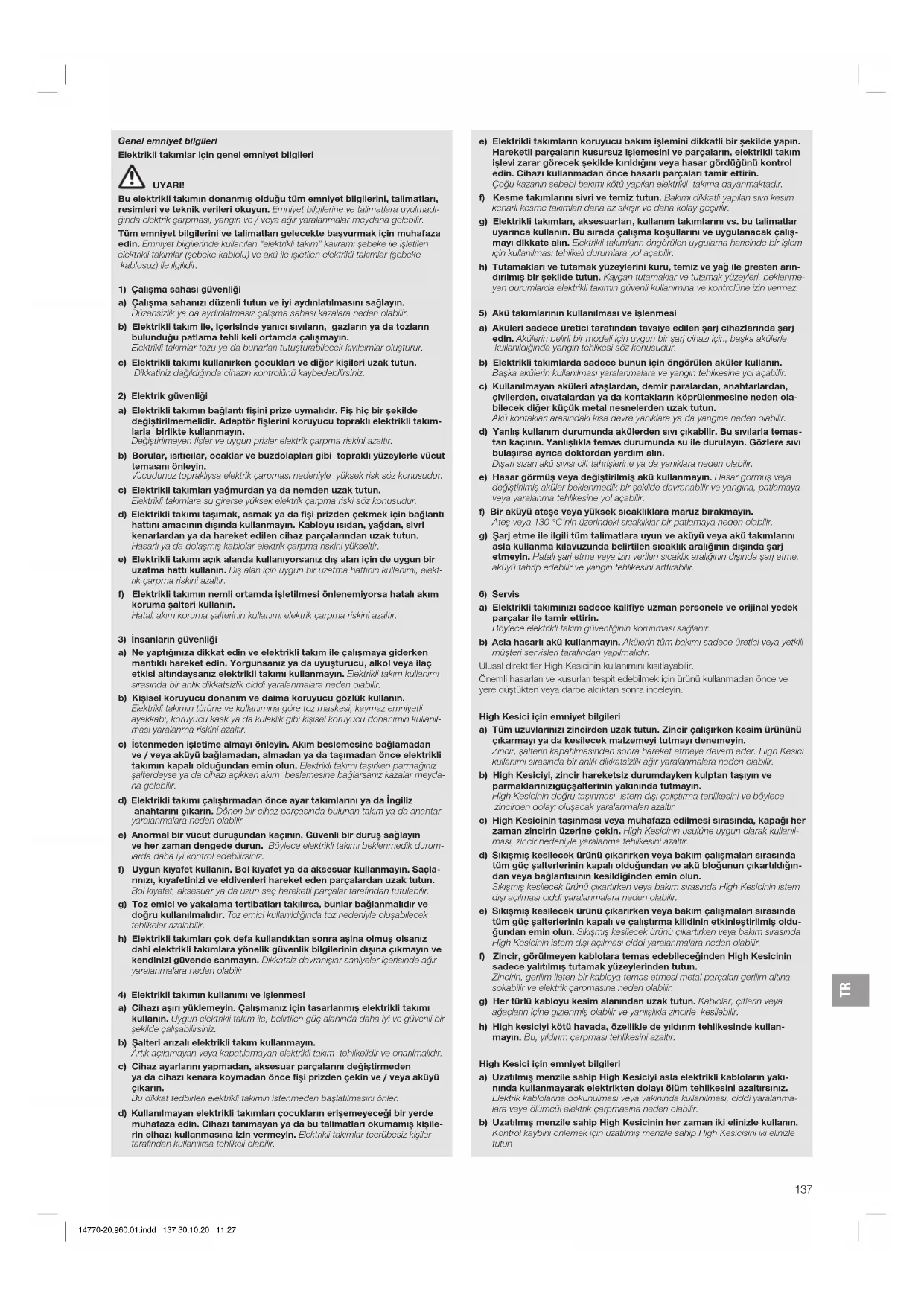 a) Elektrikli takımınızı sadece kalifiye uzman personele ve orijinal yedek parçalar ile tamir ettirin. Böylece elektrikli takım güvenliğinin korunması sağlanır. b) Asla hasarlı akü kullanmayın. Akülerin tüm bakımı sadece üretici veya yetkili müşteri servisleri tarafından yapılmalıdır. Ulusal direktifler High Kesicinin kullanımını kısıtlayabilir. Önemli hasarları ve kusurları tespit edebilmek için ürünü kullanmadan önce ve yere düştükten veya darbe aldıktan sonra inceleyin. High Kesici için emniyet bilgileri a) Tüm uzuvlarınızı zincirden uzak tutun. Zincir çalışırken kesim ürününü çıkarmayı ya da kesilecek malzemeyi tutmayı denemeyin. Zincir, şalterin kapatılmasından sonra hareket etmeye devam eder. High Kesici kullanımı sırasında bir anlık dikkatsizlik ağır yaralanmalara neden olabilir. b) High Kesiciyi, zincir hareketsiz durumdayken kulptan taşıyın ve parmaklarınızı güç şalterinin yakınında tutmayın. High Kesicinin doğru taşınması, istem dışı çalıştırma tehlikesini ve böylece zincirden dolayı oluşacak yaralanmaları azaltır. c) High Kesicinin taşınması veya muhafaza edilmesi sırasında, kapağı her zaman zincirin üzerine çekin. High Kesicinin usulüne uygun olarak kullanıl- ması, zincir nedeniyle yaralanma tehlikesini azaltır. d) Sıkışmış kesilecek ürünü çıkarırken veya bakım çalışmaları sırasında tüm güç şalterlerinin kapalı olduğundan ve akü bloğunun çıkartıldığın- dan veya bağlantısının kesildiğinden emin olun. Sıkışmış kesilecek ürünü çıkartırken veya bakım sırasında High Kesicinin istem dışı açılması ciddi yaralanmalara neden olabilir. e) Sıkışmış kesilecek ürünü çıkarırken veya bakım çalışmaları sırasında tüm güç şalterlerinin kapalı ve çalıştırma kilidinin etkinleştirilmiş oldu- ğundan emin olun. Sıkışmış kesilecek ürünü çıkartırken veya bakım sırasında High Kesicinin istem dışı açılması ciddi yaralanmalara neden olabilir. f) Zincir, görülmeyen kablolara temas edebileceğinden High Kesicinin sadece yalıtılmış tutamak yüzeylerinden tutun. Zincirin, gerilim ileten bir kabloya temas etmesi metal parçaları gerilim altına sokabilir ve elektrik çarpmasına neden olabilir. g) Her türlü kabloyu kesim alanından uzak tutun. Kablolar, çitlerin veya ağaçların içine gizlenmiş olabilir ve yanlışlıkla zincirle kesilebilir. h) High kesiciyi kötü havada, özellikle de yıldırım tehlikesinde kullan- mayın. Bu, yıldırım çarpması tehlikesini azaltır. High Kesici için emniyet bilgileri a) Uzatılmış menzile sahip High Kesiciyi asla elektrikli kabloların yakı- nında kullanmayarak elektrikten dolayı ölüm tehlikesini azaltırsınız. Elektrik kablolarına dokunulması veya yakınında kullanılması, ciddi yaralanma- lara veya ölümcül elektrik çarpmasına neden olabilir. b) Uzatılmış menzile sahip High Kesicinin her zaman iki elinizle kullanın. Kontrol kaybını önlemek için uzatılmış menzile sahip High Kesicisini iki elinizle tutun 14770-20.960.01.indd 137 30.10.20 11:27TR
