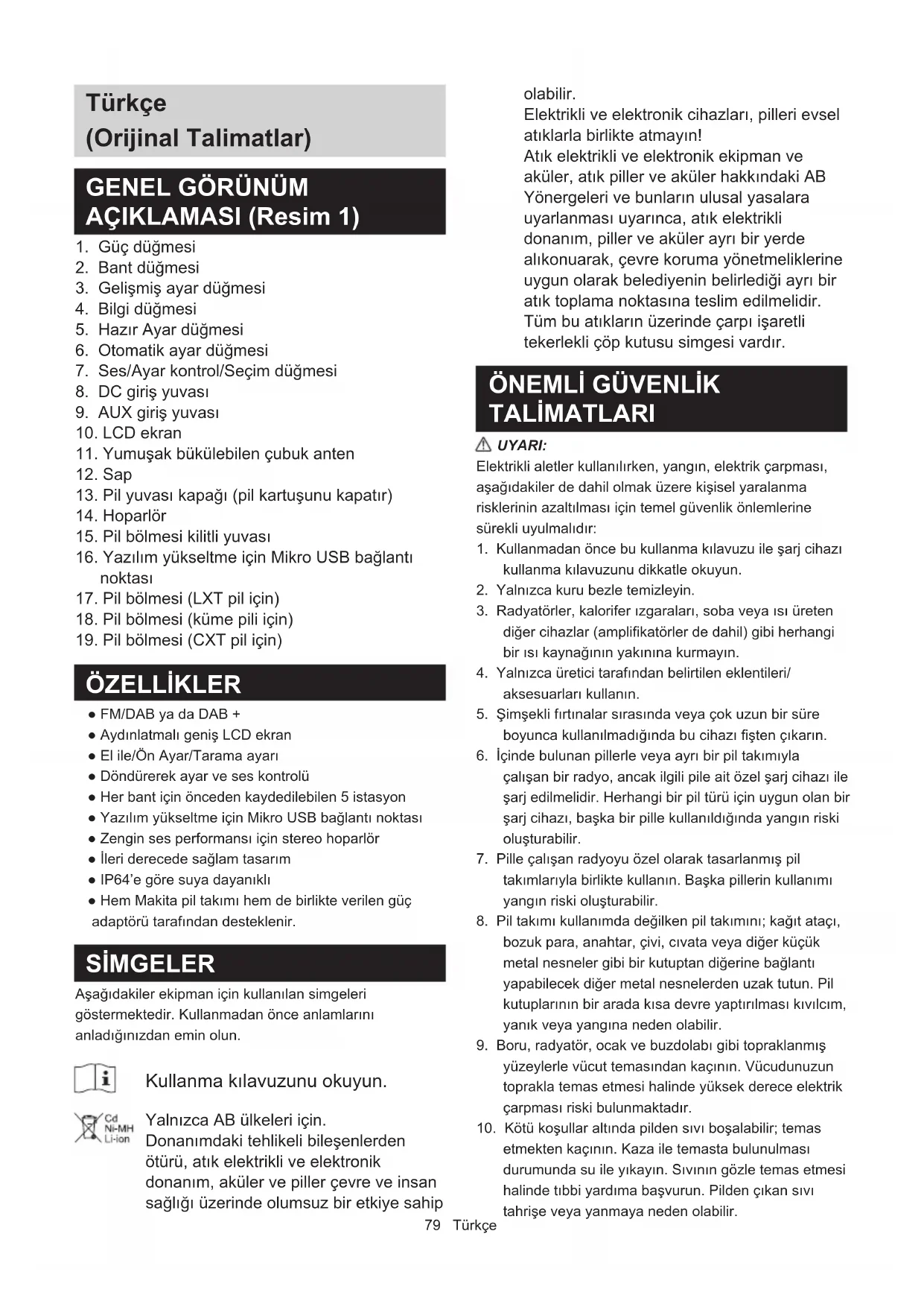 ÖZELLİKLER ● FM/DAB ya da DAB + ● Aydınlatmalı geniş LCD ekran ● El ile/Ön Ayar/Tarama ayarı ● Döndürerek ayar ve ses kontrolü ● Her bant için önceden kaydedilebilen 5 istasyon ● Yazılım yükseltme için Mikro USB bağlantı noktası ● Zengin ses performansı için stereo hoparlör ● İleri derecede sağlam tasarım ● IP64’e göre suya dayanıklı ● Hem Makita pil takımı hem de birlikte verilen güç adaptörü tarafından desteklenir. SİMGELER Aşağıdakiler ekipman için kullanılan simgeleri göstermektedir. Kullanmadan önce anlamlarını anladığınızdan emin olun. Kullanma kılavuzunu okuyun. Yalnızca AB ülkeleri için. Donanımdaki tehlikeli bileşenlerden ötürü, atık elektrikli ve elektronik donanım, aküler ve piller çevre ve insan sağlığı üzerinde olumsuz bir etkiye sahip olabilir. Elektrikli ve elektronik cihazları, pilleri evsel atıklarla birlikte atmayın! Atık elektrikli ve elektronik ekipman ve aküler, atık piller ve aküler hakkındaki AB Yönergeleri ve bunların ulusal yasalara uyarlanması uyarınca, atık elektrikli donanım, piller ve aküler ayrı bir yerde alıkonuarak, çevre koruma yönetmeliklerine uygun olarak belediyenin belirlediği ayrı bir atık toplama noktasına teslim edilmelidir. Tüm bu atıkların üzerinde çarpı işaretli tekerlekli çöp kutusu simgesi vardır.