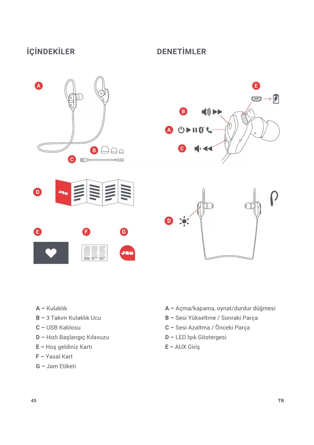 Bu sembol, pillerin çevreye ve sağlığa zararlı olabilecek maddeler içerdiği için evsel atıklarla atılmaması gerektiğini gösterir. Lütfen pilleri belirlenen toplama noktalarına atın. FKA Brands Ltd, bu radyo cihazının 2014/53/AB Direktinin temel gereklilikleri ve diğer ilgili maddeleri ile uyumlu olduğunu beyan eder. Uyumluluk Bildirgesinin bir kopyası uk.jamaudio.com/DoC adresinden edinilebilir. Tüm Hakları Saklıdır. IB-HXEP303DT49 EN 49EN 49 “Live Large” HX-EP303 BruksanvisningSV50 INNEHÅLL A – Hörlurar B – 3 stycken örontippar C – USB-sladd D – Snabbstartguider E – Välkommen-kort F – Juridiskt kort G – Jam-etikett KONTROLLER A – Effekt på/av/spela/pausa-knapp B – Volym upp / Nästa låt C – Volym ner / Tidigare låt D – LED-indikatorlampa E – AUX-in port