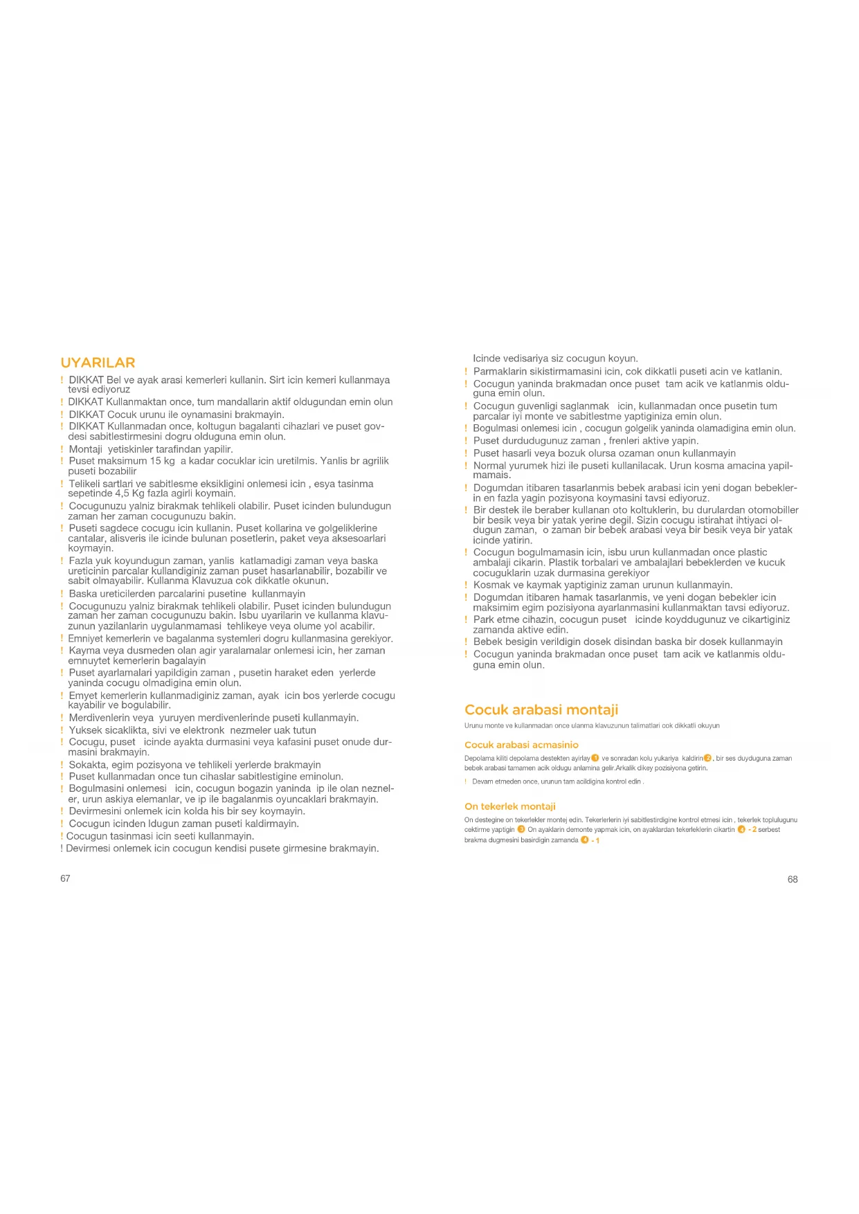 DIKKAT Kullanmaktan once, tum mandallarin aktif oldugundan emin olun ! DIKKAT Cocuk urunu ile oynamasini brakmayin. ! DIKKAT Kullanmadan once, koltugun bagalanti cihazlari ve puset gov- desi sabitlestirmesini dogru olduguna emin olun. ! Montaji yetiskinler tarafindan yapilir. ! Puset maksimum 15 kg a kadar cocuklar icin uretilmis. Yanlis br agrilik puseti bozabilir ! Telikeli sartlari ve sabitlesme eksikligini onlemesi icin , esya tasinma sepetinde 4,5 Kg fazla agirli koymain. ! Cocugunuzu yalniz birakmak tehlikeli olabilir. Puset icinden bulundugun zaman her zaman cocugunuzu bakin. ! Puseti sagdece cocugu icin kullanin. Puset kollarina ve golgeliklerine cantalar, alisveris ile icinde bulunan posetlerin, paket veya aksesoarlari koymayin. ! Fazla yuk koyundugun zaman, yanlis katlamadigi zaman veya baska ureticinin parcalar kullandiginiz zaman puset hasarlanabilir, bozabilir ve sabit olmayabilir. Kullanma Klavuzua cok dikkatle okunun. ! Baska ureticilerden parcalarini pusetine kullanmayin ! Cocugunuzu yalniz birakmak tehlikeli olabilir. Puset icinden bulundugun zaman her zaman cocugunuzu bakin. Isbu uyarilarin ve kullanma klavu- zunun yazilanlarin uygulanmamasi tehlikeye veya olume yol acabilir.