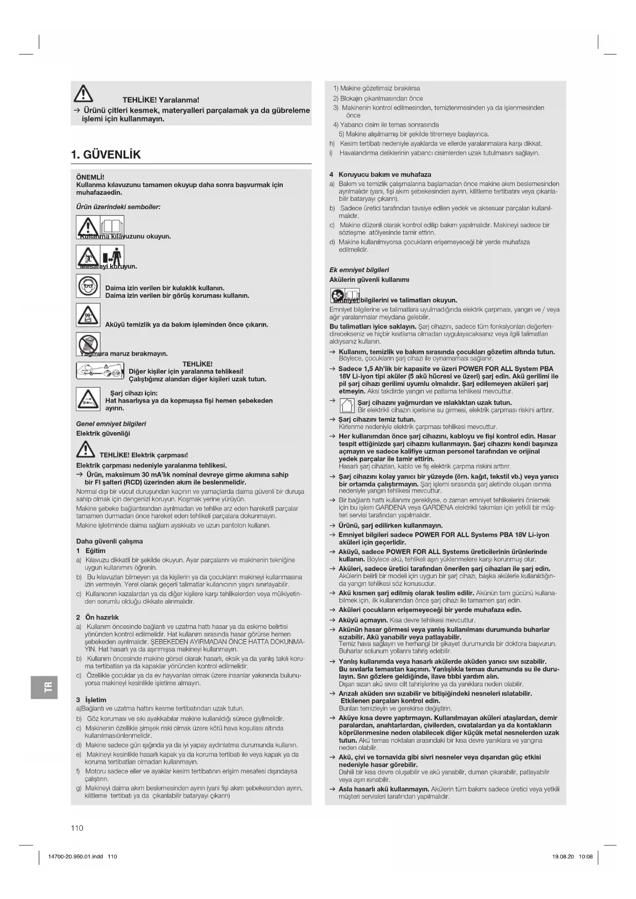 Şarj cihazını yağmurdan ve ıslaklıktan uzak tutun. Bir elektrikli cihazın içerisine su girmesi, elektrik çarpması riskini arttırır. v Şarj cihazını temiz tutun. Kirlenme nedeniyle elektrik çarpması tehlikesi mevcuttur. v Her kullanımdan önce şarj cihazını, kabloyu ve fişi kontrol edin. Hasar tespit ettiğinizde şarj cihazını kullanmayın. Şarj cihazını kendi başınıza açmayın ve sadece kalifiye uzman personel tarafından ve orijinal yedek parçalar ile tamir ettirin. Hasarlı şarj cihazları, kablo ve fiş elektrik çarpma riskini arttırır. v Şarj cihazını kolay yanıcı bir yüzeyde (örn. kağıt, tekstil vb.) veya yanıcı bir ortamda çalıştırmayın. Şarj işlemi sırasında şarj aletinde oluşan ısınma nedeniyle yangın tehlikesi mevcuttur. v Bir bağlantı hattı kullanımı gerekliyse, o zaman emniyet tehlikelerini önlemek için bu işlem GARDENA veya GARDENA elektrikli takımları için yetkili bir müş- teri servisi tarafından yapılmalıdır. v Ürünü, şarj edilirken kullanmayın. v Emniyet bilgileri sadece POWER FOR ALL Systems PBA 18V Li-iyon aküleri için geçerlidir. v Aküyü, sadece POWER FOR ALL Systems üreticilerinin ürünlerinde kullanın. Böylece akü, tehlikeli aşırı yüklenmelere karşı korunmuş olur. v Aküleri, sadece üretici tarafından önerilen şarj cihazları ile şarj edin. Akülerin belirli bir modeli için uygun bir şarj cihazı, başka akülerle kullanıldığın- da yangın tehlikesi söz konusudur. v Akü kısmen şarj edilmiş olarak teslim edilir. Akünün tam gücünü kullana- bilmek için, ilk kullanımdan önce şarj cihazı ile tamamen şarj edin. v Aküleri çocukların erişemeyeceği bir yerde muhafaza edin. v Aküyü açmayın. Kısa devre tehlikesi mevcuttur. v Akünün hasar görmesi veya yanlış kullanılması durumunda buharlar sızabilir. Akü yanabilir veya patlayabilir. Temiz hava sağlayın ve herhangi bir şikayet durumunda bir doktora başvurun. Buharlar solunum yollarını tahriş edebilir. v Yanlış kullanımda veya hasarlı akülerde aküden yanıcı sıvı sızabilir. Bu sıvılarla temastan kaçının. Yanlışlıkla temas durumunda su ile duru- layın. Sıvı gözlere geldiğinde, ilave tıbbi yardım alın. Dışarı sızan akü sıvısı cilt tahrişlerine ya da yanıklara neden olabilir. v Arızalı aküden sıvı sızabilir ve bitişiğindeki nesneleri ıslatabilir. Etkilenen parçaları kontrol edin. Bunları temizleyin ve gerekirse değiştirin. v Aküye kısa devre yaptırmayın. Kullanılmayan aküleri ataşlardan, demir paralardan, anahtarlardan, çivilerden, cıvatalardan ya da kontakların köprülenmesine neden olabilecek diğer küçük metal nesnelerden uzak tutun. Akü temas noktaları arasındaki bir kısa devre yanıklara ve yangına neden olabilir. v Akü, çivi ve tornavida gibi sivri nesneler veya dışarıdan güç etkisi nedeniyle hasar görebilir. Dahili bir kısa devre oluşabilir ve akü yanabilir, duman çıkarabilir, patlayabilir veya aşırı ısınabilir. v Asla hasarlı akü kullanmayın. Akülerin tüm bakımı sadece üretici veya yetkili müşteri servisleri tarafından yapılmalıdır. TEHLIKE! Yaralanma! v Ürünü çitleri kesmek, materyalleri parçalamak ya da gübreleme işlemi için kullanmayın. 14700-20.960.01.indd 110 19.08.20 10:08TR