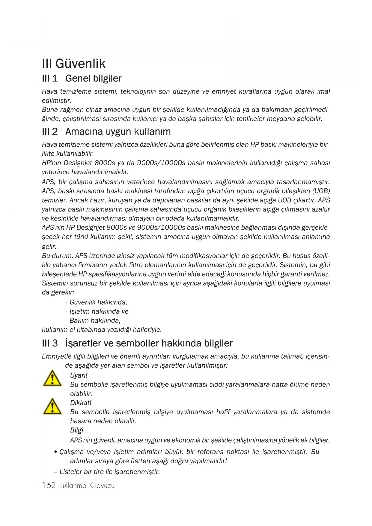 HP Designjet APS 8000s / 9000s/10000s filtre 12 Filtre kaldýrma mekanizmasý 13 Hava üfleme ýzgarasý162 Kullanma Kilavuzu III Güvenlik III 11 Genel bbilgiler Hava temizleme sistemi, teknolojinin son düzeyine ve emniyet kurallarýna uygun olarak imal edilmiþtir. Buna raðmen cihaz amacýna uygun bir þekilde kullanýlmadýðýnda ya da bakýmdan geçirilmedi- ðinde, çalýþtýrýlmasý sýrasýnda kullanýcý ya da baþka þahýslar için tehlikeler meydana gelebilir. III 22 Amacýna uuygun kkullaným Hava temizleme sistemi yalnýzca özellikleri buna göre belirlenmiþ olan HP baský makineleriyle bir- likte kullanýlabilir. HP'nin Designjet 8000s ya da 9000s/10000s baský makinelerinin kullanýldýðý çalýþma sahasý yeterince havalandýrýlmalýdýr. APS, bir çalýþma sahasýnýn yeterince havalandýrýlmasýný saðlamak amacýyla tasarlanmamýþtýr. APS, baský sýrasýnda baský makinesi tarafýndan açýða çýkartýlan uçucu organik bileþikleri (UOB) temizler. Ancak hazýr, kuruyan ya da depolanan baskýlar da ayný þekilde açýða UOB çýkartýr. APS yalnýzca baský makinesinin çalýþma sahasýnda uçucu organik bileþiklerin açýða çýkmasýný azaltýr ve kesinlikle havalandýrmasý olmayan bir odada kullanýlmamalýdýr. APS'nin HP Designjet 8000s ve 9000s/10000s baský makinesine baðlanmasý dýþýnda gerçekle- þecek her türlü kullaným þekli, sistemin amacýna uygun olmayan þekilde kullanýlmasý anlamýna gelir. Bu durum, APS üzerinde izinsiz yapýlacak tüm modifikasyonlar için de geçerlidir. Bu husus özelli- kle yabancý firmalarýn yedek filtre elemanlarýnýn kullanýlmasý için de geçerlidir. Sistemin, bu gibi bileþenlerle HP spesifikasyonlarýna uygun verimi elde edeceði konusunda hiçbir garanti verilmez. Sistemin sorunsuz bir þekilde kullanýlmasý için ayrýca aþaðýdaki konularla ilgili bilgilere uyulmasý da gerekir: - Güvenlik hakkýnda, - Ýþletim hakkýnda ve - Bakým hakkýnda, kullaným el kitabýnda yazýldýðý halleriyle. III 33 Ýþaretler vve ssemboller hhakkýnda bbilgiler Emniyetle ilgili bilgileri ve önemli ayrýntýlarý vurgulamak amacýyla, bu kullanma talimatý içerisin- de aþaðýda yer alan sembol ve iþaretler kullanýlmýþtýr: Uyarý! Bu sembolle iþaretlenmiþ bilgiye uyulmamasý ciddi yaralanmalara hatta ölüme neden olabilir. Dikkat! Bu sembolle iþaretlenmiþ bilgiye uyulmamasý hafif yaralanmalara ya da sistemde hasara neden olabilir. Bilgi APS'nin güvenli, amacýna uygun ve ekonomik bir þekilde çalýþtýrýlmasýna yönelik ek bilgiler.