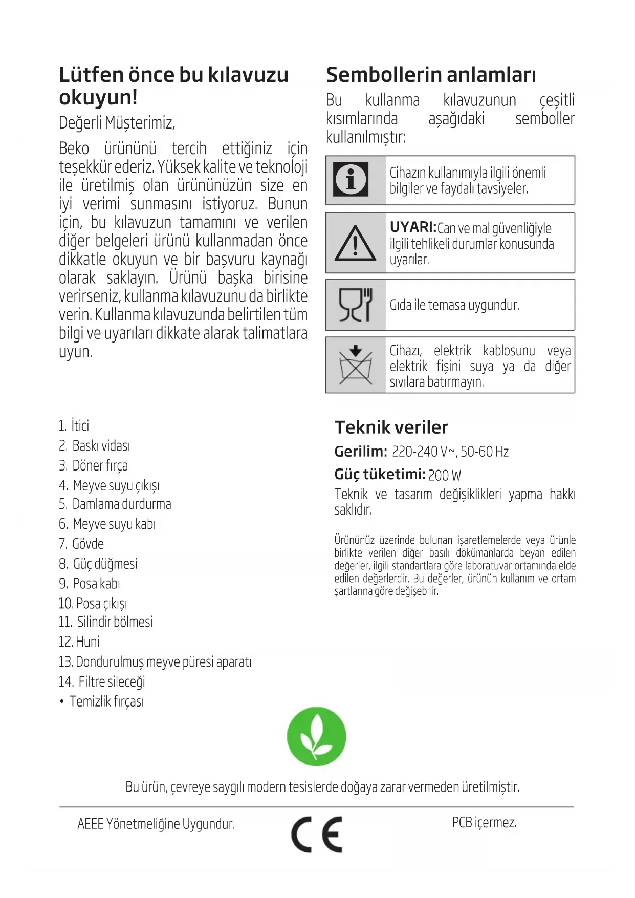 UYARI: Can ve mal güvenliğiyle ilgili tehlikeli durumlar konusunda uyarılar. Gıda ile temasa uygundur. Cihazı, elektrik kablosunu veya elektrik fişini suya ya da diğer sıvılara batırmayın. Bu ürün, çevreye saygılı modern tesslerde doğaya zarar vermeden üretlmştr. AEEE Yönetmelğne Uygundur. PCB çermez.