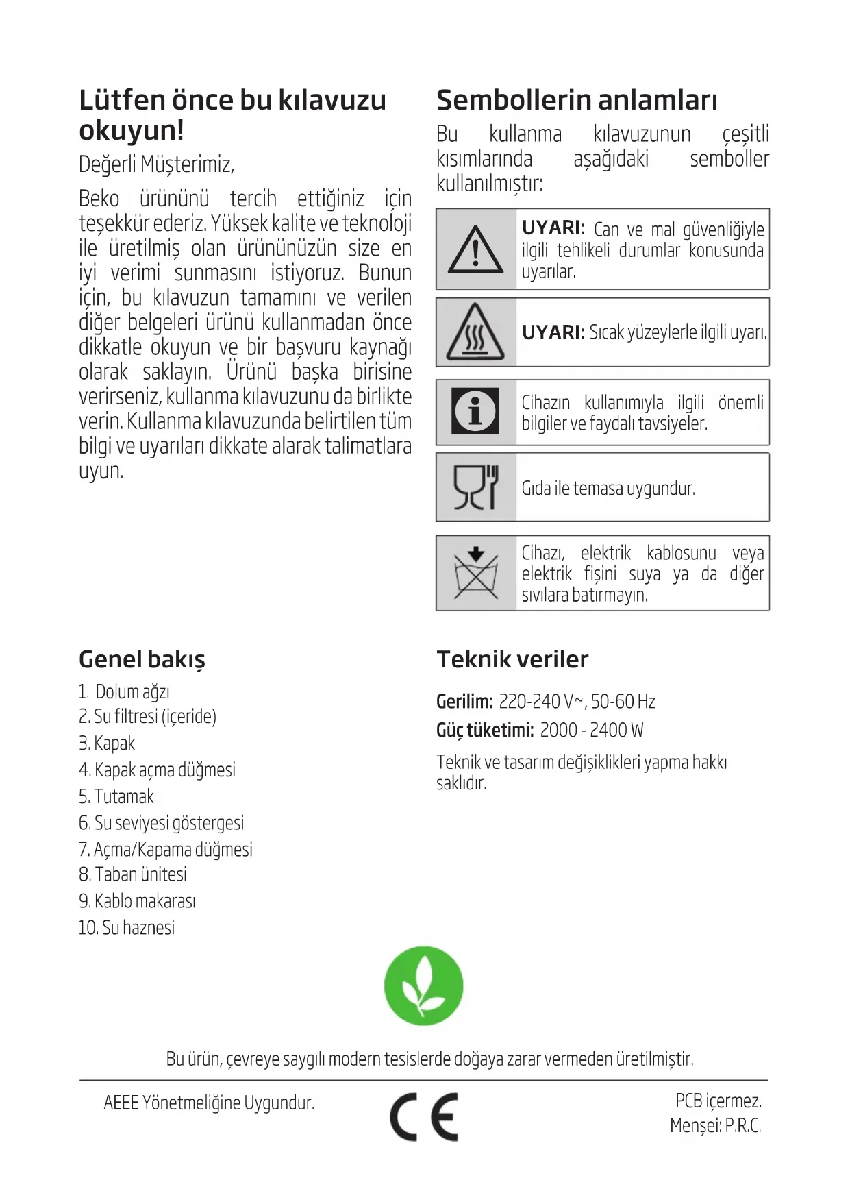 - Toute chute de l’appareil peut le rendre non opérationnel ou l’endommager de façon permanente.Lütfen önce bu kılavuzu okuyun! Değerl Müştermz, Beko ürününü terch ettğnz çn teşekkür ederz. Yüksek kalte ve teknoloj le üretlmş olan ürününüzün sze en y verm sunmasını styoruz. Bunun çn, bu kılavuzun tamamını ve verlen dğer belgeler ürünü kullanmadan önce dkkatle okuyun ve br başvuru kaynağı olarak saklayın. Ürünü başka brsne verrsenz, kullanma kılavuzunu da brlkte vern. Kullanma kılavuzunda belrtlen tüm blg ve uyarıları dkkate alarak talmatlara uyun. Bu ürün, çevreye saygılı modern tesslerde doğaya zarar vermeden üretlmştr. AEEE Yönetmelğne Uygundur. PCB çermez. Menşe: P.R.C. Genel bakış