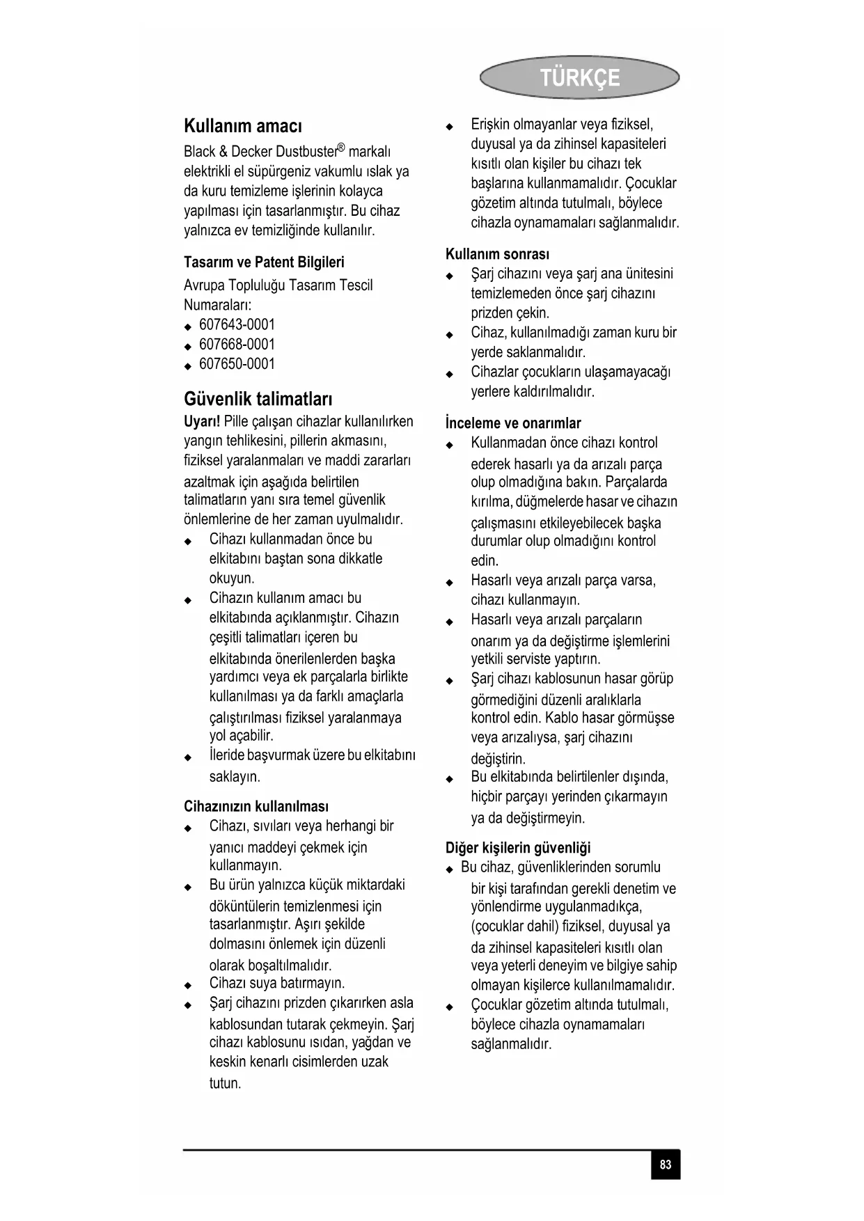 Black & Decker Dustbuster® markali elektrikli el supürgenizvakumlıslak ya da kuru temizlemislelirinin kolayca yapilmasi icin tasarlanmistr. Bu cihaz yalinizca ev temizliginde kullanilir.