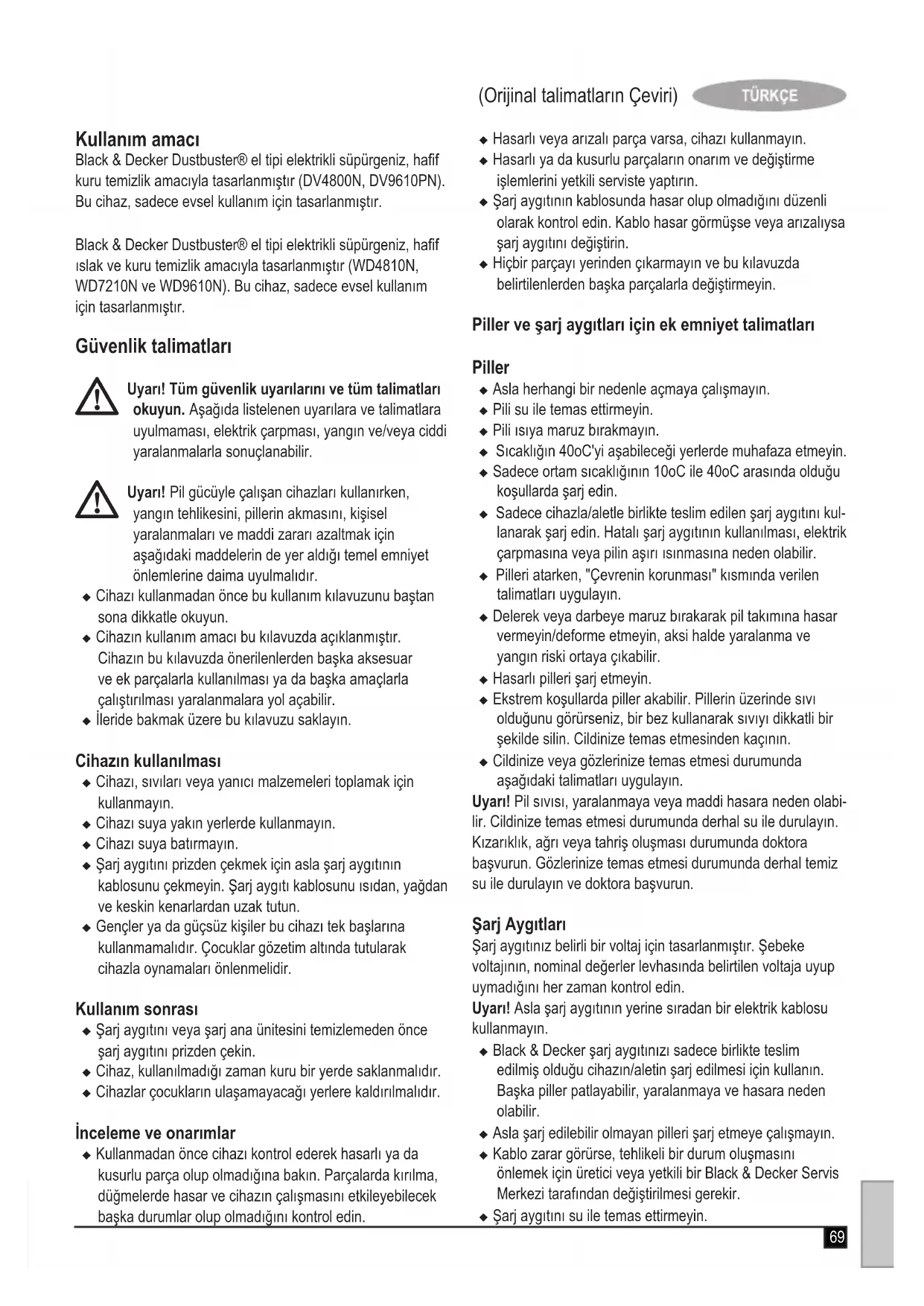 Montaj Duvar Askısı (Şek. C) (Sadece DV9610PN) Konforlu saklama ve cihaz için şarj noktası sağlanması amacıyla ürün duvara sabitlenebilir. Duvara sabitleme için, sabitleme yönteminin duvar tipine ve cihazın ağırlığına uygun olduğundan emin olun. u Vida deliklerinin konumunu işaretleyin (elektrik süpürgesi- nin duvar askısında bulunduğu sırada şarj edilebilmesi için bir elektrik prizine yakın olmalıdır). u Şarj aygıtı kablosunu, yaklaşık 20-22 cm pay olacak şekilde duvar askısı braketindeki kıvrımlı yuvaya sokun.71 (Orijinal talimatların Çeviri) u Elektrik süpürgesinin tabanındaki açıklığı duvar askısı braketinin üzerindeki kancalara yerleştirerek cihazı duvara asın. Cihazın Kurulması Aksesuarlar (Şek. B) Bu modeller, aşağıdaki aksesuarlardan bazıları ile birlikte teslim edilebilir: u Sert zeminler üzerinde ıslak kullanım için ıslak emme aleti (12). (Sadece WD4810N, WD7210N ve WD9610N) u Kesik havlı halılar üzerinde süpürme için elektrikli fırça kafası (13). Elektrikli fırça kafası özellikle saç, iplik, vs. toplamak için kullanışlıdır. (Sadece DV9610PN) Takma (Şek. D) u Uygun aksesuarı cihazın ön kısmına sokun. Aksesuarın yerine sonuna kadar itildiğinden emin olun. Kullanım u İlk kullanımdan önce, pilin en az 24 saat şarj edilmesi gerekmektedir. u Cihazı, kullanılmadığı zamanlarda şarj ana ünitesi- nin üzerinde tutun. (Sadece WD4810N, WD7210N ve WD9610N) Uyarı! Şarj etmeden önce, cihazınızın hasar görmemesi için cihazın içindeki tüm sıvıyı boşaltın ve cihazı tamamen kurun. Pilin şarj edilmesi (Şek. E ve F) u Cihazın kapalı olduğundan emin olun. Açma/kapatma düğmesi açık konumdayken pil şarj olmaz. u Şarj aygıtının (6) jakını cihazın şarj soketine (4) takın (Şek. E). (Sadece DV4800N ve DV9610PN) u Cihazı, şarj ana ünitesinin (7) üzerine yerleştirin (Şek. F). (Sadece WD4810N, WD7210N ve WD9610N) u Şarj aygıtını şe takın. Şebeke elektriği beslemesini açın. Şarj göstergesi (3) yanar. u Cihazı en az 16 saat şarjda bırakın. Şarj aygıtı, şarj sırasında ısınabilir. Bu durum normaldir ve bir arıza belirtisi değildir. Cihaz sınırsız bir süre boyunca şarj aygıtına bağlı olarak bırakılabilir. Cihaz, prize takılı durumdaki şarj aygıtına bağlı kaldığı sürece şarj göstergesi (3) yanar. Uyarı! Ortam sıcaklığının 4oC'nin altında veya 40oC'nin üzerinde olduğu koşullarda pili şarj etmeyin. Açma ve kapatma (Şek. G) u Cihazı açmak için açma/kapatma düğmesini (1) 1 konu- muna doğru kaydırın. u Cihazı kapatmak için açma/kapatma düğmesini (1) yeni- den 0 konumuna doğru kaydırın. Kuru toplama (DV4800N, DV9610PN) u Gündelik olarak dökülen kuru malzeme için. Islak ve kuru toplama (Sadece WD4810N, WD7210N ve WD9610N) u Gündelik olarak dökülen kuru malzemeler için cihazı ıslak emme aksesuarı olmaksızın kullanın. Uyarı! Ürününüz sadece haf temizlik için tasarlanmıştır. u Bu cihaz aynı zamanda gündelik olarak dökülen sıvılar için de kullanılabilir. Islak emme aksesuarını emici olmayan sert zeminlerde kullanın. Halı gibi emici zeminlerde, cihazınız dökülen sıvıları aksesuar olmaksızın daha iyi toplar. u Sert zeminlerde ıslak toplama için en yüksek performansı elde etmek amacıyla, ıslak emme aksesuarını hazne ucu açıklığına sokun. u Bu aksesuarı kullanarak en iyi sonuçları elde etmek için, cihazı 45o açıyla tutun ve yavaşça kendinize doğru çekin. u Hazneyi emme kanalının ucunu aşacak şekilde doldurmayın. Haznede sıvı varsa, cihazı baş aşağı veya yana doğru döndürmeyin, emme ucunu yukarıya kaldırmayın veya elektrik süpürgesini aşırı biçimde sallamayın. u Sıvı maddeleri topladıktan sonra, hemen cihazı ve ltreyi temizleyin. Islak toplamanın ardından uygun şekilde temizlenmemesi durumunda cihazın içinde küf oluşabilir. u Şarj etmeden önce, cihazınızın hasar görmemesi için cihazın içindeki tüm sıvıyı boşaltın ve cihazı tamamen kurun. Emme kuvvetinin optimize edilmesi Emme kuvvetinin optimum düzeyde tutulması için kullanım sırasında ltreler düzenli olarak temizlenmelidir. Ürünün boşaltılması ve temizlenmesi. Toz haznesinin ve ltrelerin sökülmesi (Şek. H, I, J ve K). Uyarı! Filtreler yeniden kullanılabilir ve düzenli olarak temi- zlenmelidir. u Serbest bırakma mandalını (2) bastırın ve toz haznesini (5) doğrudan çekerek çıkarın. u Toz haznesini bir çöp kovasının veya lavabonun üzerinde tutarken ltreyi çekerek haznenin içeriğini boşaltın. u Toz haznesini yerine takmak için "klik" sesiyle sıkıca yerine oturuncaya kadar tutamağın içine sokun. Uyarı! Cihazı asla ltreleri olmadan kullanmayın. Azami toz toplama kapasitesi sadece temiz ltrelerle elde edilebilir.72 (Orijinal talimatların Çeviri) Köpük dolgusu (Şek. J) (WD4810N, WD7210N ve WD9610N) u Köpük dolgusunu (10) ıslak/kuru deektörünün (11) ortasına yerleştirin. Uyarı! Su deektörü ve köpük dolgusu olmadan, cihazı asla ıslak uygulamalar için kullanmayın. Ön ltre (Şek. K) (DV9610PN) Filtre ile ön ltre, daha iyi temizliğe olanak sağlamak için ayrılabilir. u Ön ltreyi (9) saat yönünde çevirin ve ltrenin (8) üzerinden kaldırın. Toz haznelerinin ve ltrelerin temizlenmesi u Toz hazneleri ve ltreler ılık sabunlu suda yıkanabilir. u Filtrelerin ve toz haznesinin yeniden takılmadan önce kuru olduğundan emin olun. Filtrelerin değiştirilmesi Filtreler her 6 veya 9 ayda bir ve her aşındığında veya hasar gördüğünde değiştirilmelidir. Yedek ltreler Black & Decker yetkili satıcınızdan temin edilebilir: Model: DV4800N için VF110-XJ parça numaralı ltreyi kullanın Modeller: DV9610PN için VF110P-XJ parça numaralı ltreyi kullanın Modeller: WD4810N, WD7210N ve WD9610N için WVF110- XJ parça numaralı ltreyi kullanın Bakım Black & Decker