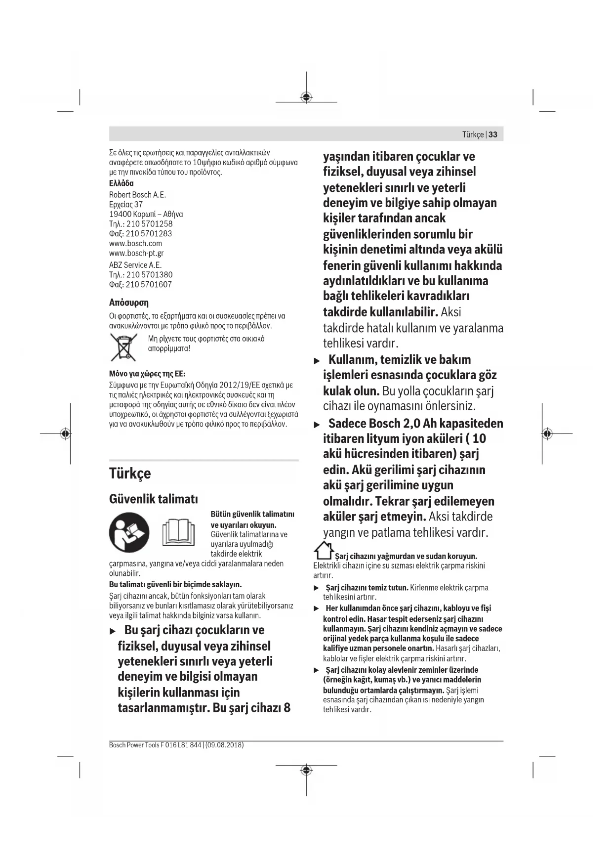 Οι φορτιστές, τα εξαρτήματα και οι συσκευασίες πρέπει να ανακυκλώνονται με τρόπο φιλικό προς το περιβάλλον. Μη ρίχνετε τους φορτιστές στα οικιακά απορρίμματα! Μόνο για χώρες τηςΕΕ: Σύμφωνα με την Ευρωπαϊκή Οδηγία 2012/19/ΕΕ σχετικά με τις παλιές ηλεκτρικές και ηλεκτρονικές συσκευές και τη μεταφορά της οδηγίας αυτής σε εθνικό δίκαιο δεν είναι πλέον υποχρεωτικό, οι άχρηστοι φορτιστές να συλλέγονται ξεχωριστά για να ανακυκλωθούν με τρόπο φιλικό προς το περιβάλλον. Türkçe Güvenlik talimatı Bütün güvenlik talimatını ve uyarıları okuyun. Güvenlik talimatlarına ve uyarılara uyulmadığı takdirde elektrik çarpmasına, yangına ve/veya ciddi yaralanmalara neden olunabilir. Bu talimatı güvenli bir biçimde saklayın. Şarj cihazını ancak, bütün fonksiyonları tam olarak biliyorsanız ve bunları kısıtlamasız olarak yürütebiliyorsanız veya ilgili talimat hakkında bilginiz varsa kullanın. u Bu şarj cihazı çocukların ve fiziksel, duyusal veya zihinsel yetenekleri sınırlı veya yeterli deneyim ve bilgisi olmayan kişilerin kullanması için tasarlanmamıştır. Bu şarj cihazı 8 yaşından itibaren çocuklar ve fiziksel, duyusal veya zihinsel yetenekleri sınırlı ve yeterli deneyim ve bilgiye sahip olmayan kişiler tarafından ancak güvenliklerinden sorumlu bir kişinin denetimi altında veya akülü fenerin güvenli kullanımı hakkında aydınlatıldıkları ve bu kullanıma bağlı tehlikeleri kavradıkları takdirde kullanılabilir. Aksi takdirde hatalı kullanım ve yaralanma tehlikesi vardır. u Kullanım, temizlik ve bakım işlemleri esnasında çocuklara göz kulak olun. Bu yolla çocukların şarj cihazı ile oynamasını önlersiniz. u Sadece Bosch 2,0 Ah kapasiteden itibaren lityum iyon aküleri ( 10 akü hücresinden itibaren) şarj edin. Akü gerilimi şarj cihazının akü şarj gerilimine uygun olmalıdır. Tekrar şarj edilemeyen aküler şarj etmeyin. Aksi takdirde yangın ve patlama tehlikesi vardır. Şarj cihazını yağmurdan ve sudan koruyun. Elektrikli cihazın içine su sızması elektrik çarpma riskini artırır. u Şarj cihazını temiz tutun. Kirlenme elektrik çarpma tehlikesini artırır. u Her kullanımdan önce şarj cihazını, kabloyu ve fişi kontrol edin. Hasar tespit ederseniz şarj cihazını kullanmayın. Şarj cihazını kendiniz açmayın ve sadece orijinal yedek parça kullanma koşulu ile sadece kalifiye uzman personele onartın. Hasarlı şarj cihazları, kablolar ve fişler elektrik çarpma riskini artırır. u Şarj cihazını kolay alevlenir zeminler üzerinde (örneğin kağıt, kumaş vb.) ve yanıcı maddelerin bulunduğu ortamlarda çalıştırmayın. Şarj işlemi esnasında şarj cihazından çıkan ısı nedeniyle yangın tehlikesi vardır. Türkçe | 33 Bosch Power Tools F 016 L81 844 | (09.08.2018)34 | Türkçe F 016 L81 844 | (09.08.2018) Bosch Power Tools u Akü hasar görürse veya usulüne aykırı kullanılırsa dışarı buhar sızabilir. Çalıştığınız yeri havalandırın ve şikayet olursa hekime başvurun. Akülerden çıkan buharlar nefes yollarını tahriş edebilir. u Şarj cihazının havalandırma deliklerini kapatmayın. Aksi takdirde şarj cihazı aşırı ölçüde ısınabilir ve doğru işlev göremez. Ürün ve performans açıklaması Şekli gösterilen elemanlar Şekli gösterilen elemanların numaraları grafik sayfasındaki şarj cihazının resmindeki numaralarla aynıdır. (1) Akü