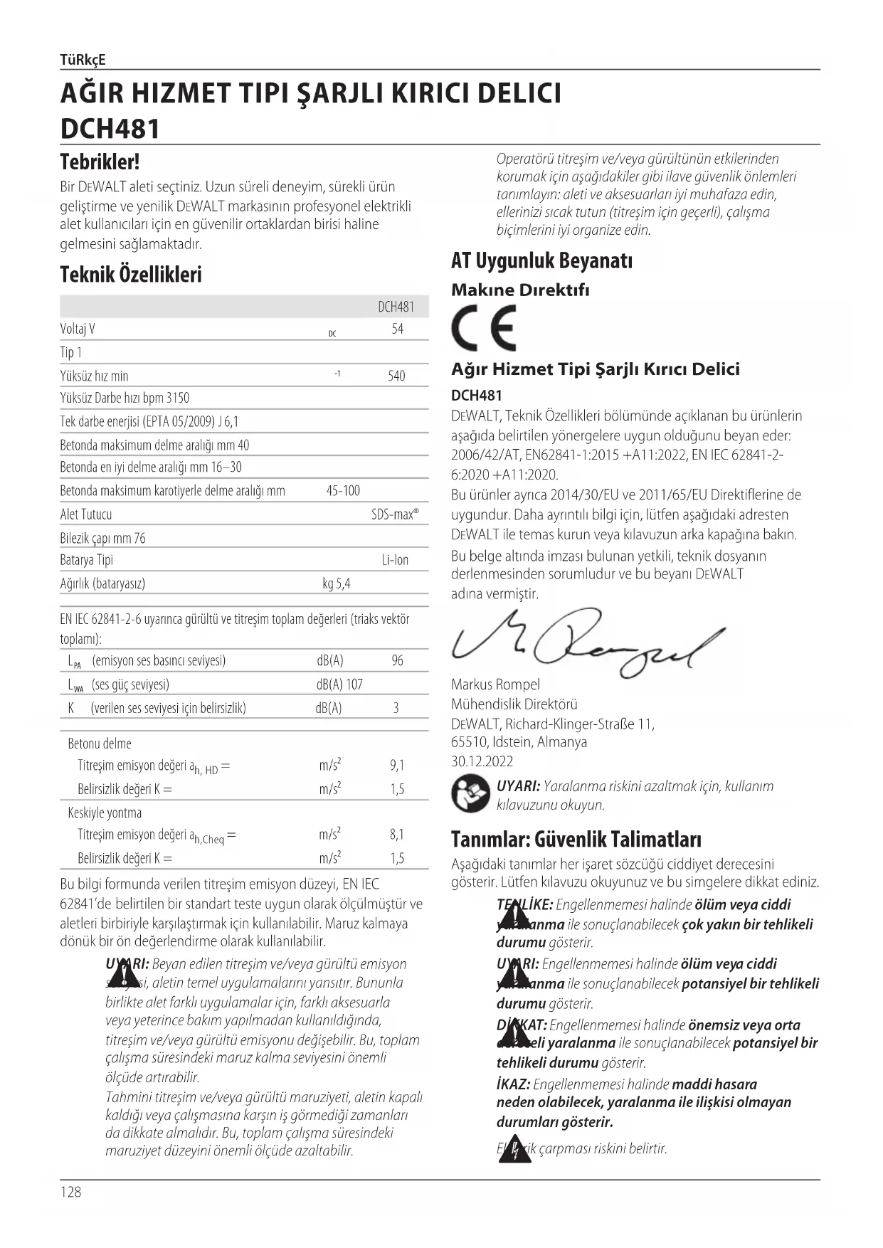 - Litiumjonbatteripaket celler är återvinningsbara. Lämna dem hos din återförsäljare eller på en återvinningsstation. De insamlade batteripaketen kommer att återvinnas eller avyttraskorrekt.128 TüRkçE AT Uygunluk Beyanatı Makıne Dırektıfı Ağır Hizmet Tipi Şarjlı Kırıcı Delici DCH481 DeWALT, Teknik Özellikleri bölümünde açıklanan bu ürünlerin aşağıda belirtilen yönergelere uygun olduğunu beyan eder: 2006/42/AT, eN62841-1:2015 +A11:2022, eN IeC 62841-2- 6:2020 +A11:2020. Bu ürünler ayrıca 2014/30/EU ve 2011/65/EU Direktiflerine de uygundur. Daha ayrıntılı bilgi için, lütfen aşağıdaki adresten DeWALT ile temas kurun veya kılavuzun arka kapağınabakın. Bu belge altında imzası bulunan yetkili, teknik dosyanın derlenmesinden sorumludur ve bu beyanı DeWALT adınavermiştir. Markus Rompel Mühendislik Direktörü DeWALT, Richard-Klinger-Straße 11, 65510, Idstein, Almanya