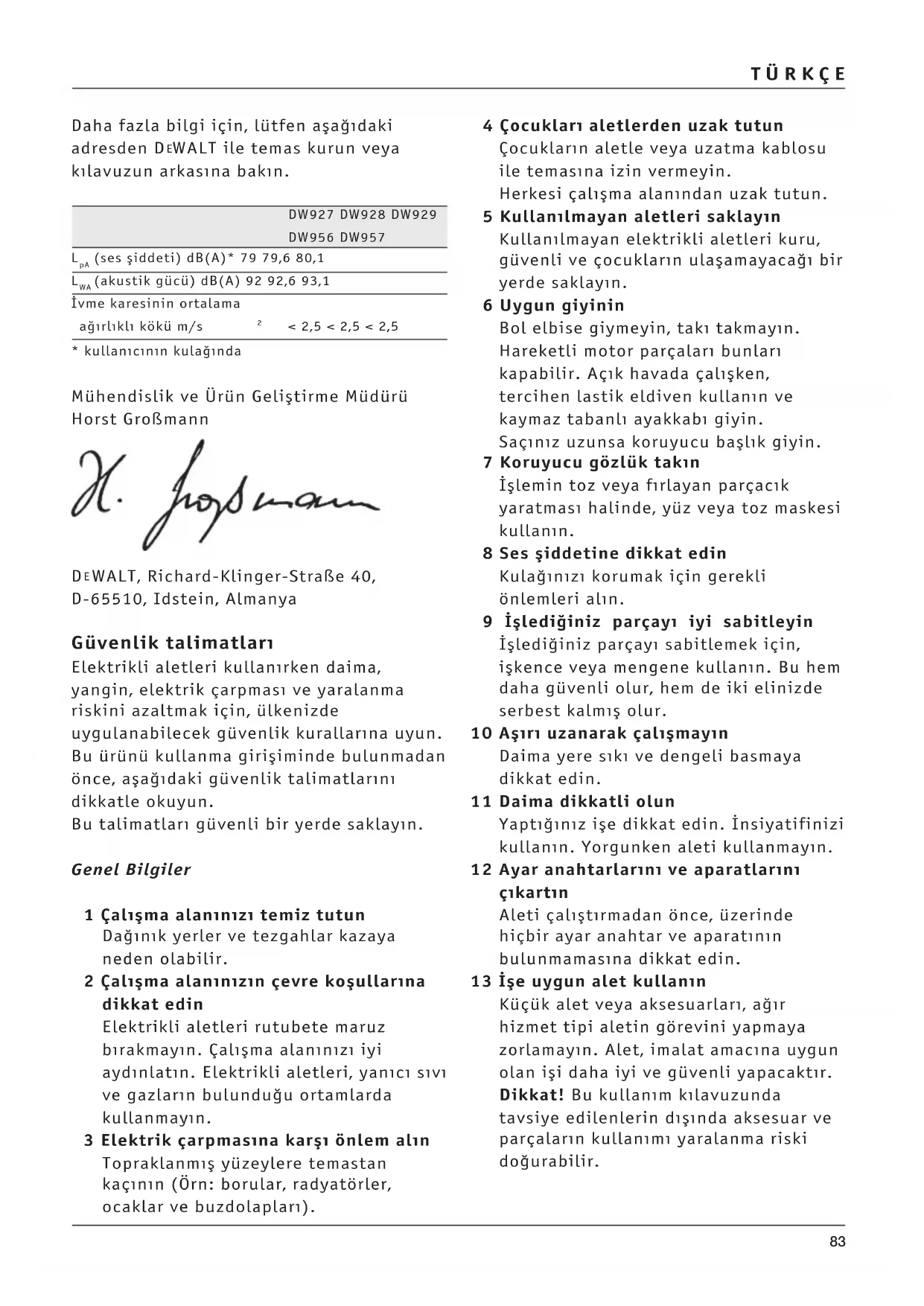 Şarj süresi (aşağ) min 60 60 60 Ağrlk kg 0,4 0,4 0,4 Sigortalar: 230 V aletler 10 A Bu klavuzun tümünde, aşağdaki semboller kullanlmştr: Bu klavuzdaki talimatlara uyulmamas halinde, yaralanma, ölüm veya aletin hasar görmesi tehlikesi olduğunu gösterir. Elektrik çarpmas tehlikesi olduğunu gösterir. Avrupa Birliği şartnameye uygunluk beyan DW927/DW928/DW929/DW956/DW957