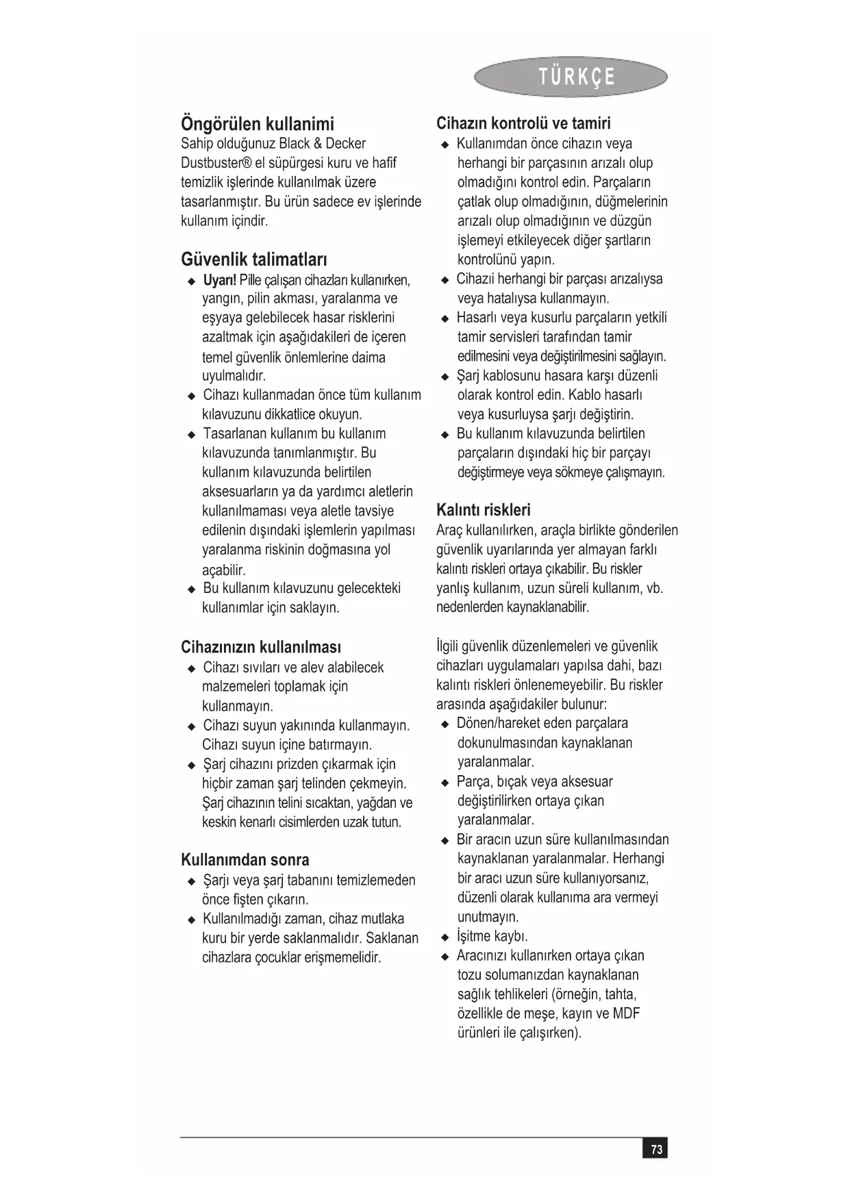 Öngörülen kullanimi Sahip olduğunuz Black & Decker Dustbuster® el süpürgesi kuru ve haf temizlik işlerinde kullanılmak üzere tasarlanmıştır. Bu ürün sadece ev işlerinde kullanım içindir. Güvenliktalimatları u Uyarı! Pille çalışan cihazları kullanırken, yangın, pilin akması, yaralanma ve eşyaya gelebilecek hasar risklerini azaltmak için aşağıdakileri de içeren temel güvenlik önlemlerine daima uyulmalıdır. u Cihazı kullanmadan önce tüm kullanım kılavuzunu dikkatlice okuyun. u Tasarlanan kullanım bu kullanım kılavuzunda tanımlanmıştır. Bu kullanım kılavuzunda belirtilen aksesuarların ya da yardımcı aletlerin kullanılmaması veya aletle tavsiye edilenin dışındaki işlemlerin yapılması yaralanma riskinin doğmasına yol açabilir. u Bu kullanım kılavuzunu gelecekteki kullanımlar için saklayın. Cihazınızınkullanılması u Cihazı sıvıları ve alev alabilecek malzemeleri toplamak için kullanmayın. u Cihazı suyun yakınında kullanmayın. Cihazı suyun içine batırmayın. u Şarj cihazını prizden çıkarmak için hiçbir zaman şarj telinden çekmeyin. Şarj cihazının telini sıcaktan, yağdan ve keskin kenarlı cisimlerden uzak tutun. Kullanımdansonra u Şarjı veya şarj tabanını temizlemeden önce şten çıkarın. u Kullanılmadığı zaman, cihaz mutlaka kuru bir yerde saklanmalıdır. Saklanan cihazlara çocuklar erişmemelidir. Cihazınkontrolüvetamiri u Kullanımdan önce cihazın veya herhangi bir parçasının arızalı olup olmadığını kontrol edin. Parçaların çatlak olup olmadığının, düğmelerinin arızalı olup olmadığının ve düzgün işlemeyi etkileyecek diğer şartların kontrolünü yapın. u Cihazıi herhangi bir parçası arızalıysa veya hatalıysa kullanmayın. u Hasarlı veya kusurlu parçaların yetkili tamir servisleri tarafından tamir edilmesini veya değiştirilmesini sağlayın. u Şarj kablosunu hasara karşı düzenli olarak kontrol edin. Kablo hasarlı veya kusurluysa şarjı değiştirin. u Bu kullanım kılavuzunda belirtilen parçaların dışındaki hiç bir parçayı değiştirmeye veya sökmeye çalışmayın. Kalıntıriskleri Araç kullanılırken, araçla birlikte gönderilen güvenlik uyarılarında yer almayan farklı kalıntı riskleri ortaya çıkabilir. Bu riskler yanlış kullanım, uzun süreli kullanım, vb. nedenlerden kaynaklanabilir. İlgili güvenlik düzenlemeleri ve güvenlik cihazları uygulamaları yapılsa dahi, bazı kalıntı riskleri önlenemeyebilir. Bu riskler arasında aşağıdakiler bulunur: u Dönen/hareket eden parçalara dokunulmasından kaynaklanan yaralanmalar. u Parça, bıçak veya aksesuar değiştirilirken ortaya çıkan yaralanmalar. u Bir aracın uzun süre kullanılmasından kaynaklanan yaralanmalar. Herhangi bir aracı uzun süre kullanıyorsanız, düzenli olarak kullanıma ara vermeyi unutmayın. u İşitme kaybı.u Aracınızı kullanırken ortaya çıkan tozu solumanızdan kaynaklanan sağlık tehlikeleri (örneğin, tahta, özellikle de meşe, kayın ve MDF ürünleri ile çalışırken).74