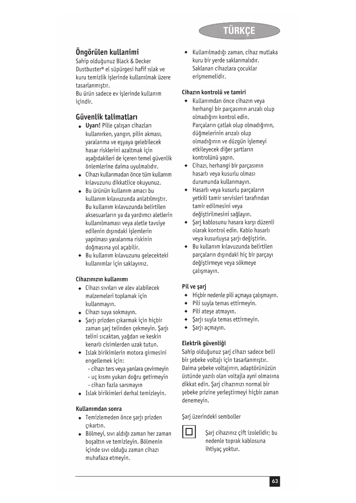 Öngörülen kullanimi Sahip olduğunuz Black & Decker Dustbuster® el süpürgesi hafif slak ve kuru temizlik işlerinde kullanlmak üzere tasarlanmştr. Bu ürün sadece ev işlerinde kullanm içindir. Güvenlik talimatlar