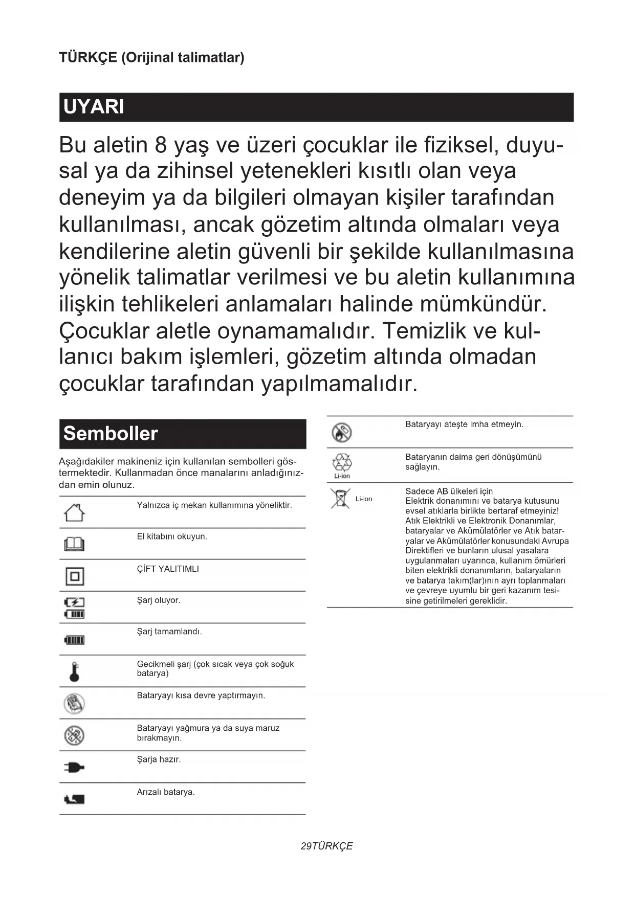 ΠΑΡΑΤΗΡΗΣΗ: Αν το λαμπάκι φόρτισης αναβοσβήνει εναλλάξ με πράσινο και κόκκινο χρώμα, η φόρτιση δεν είναι δυνατή. Οι ακροδέκτες στον φορτιστή ή στην κασέτα μπαταριών είναι καλυμμένη με σκόνη ή η κασέτα μπαταριών είναι φθαρμένη ή κατεστραμμένη.29 TÜRKÇE TÜRKÇE (Orijinal talimatlar) UYARI Bu aletin 8 yaş ve üzeri çocuklar ile ziksel, duyu- sal ya da zihinsel yetenekleri kısıtlı olan veya deneyim ya da bilgileri olmayan kişiler tarafından kullanılması, ancak gözetim altında olmaları veya kendilerine aletin güvenli bir şekilde kullanılmasına yönelik talimatlar verilmesi ve bu aletin kullanımına ilişkin tehlikeleri anlamaları halinde mümkündür. Çocuklar aletle oynamamalıdır. Temizlik ve kul- lanıcı bakım işlemleri, gözetim altında olmadan çocuklar tarafından yapılmamalıdır. Semboller Aşağıdakiler makineniz için kullanılan sembolleri gös- termektedir. Kullanmadan önce manalarını anladığınız- dan emin olunuz. Yalnızca iç mekan kullanımına yöneliktir. El kitabını okuyun. ÇİFT YALITIMLI Şarj oluyor. Şarj tamamlandı. Gecikmeli şarj (çok sıcak veya çok soğuk batarya) Bataryayı kısa devre yaptırmayın. Bataryayı yağmura ya da suya maruz bırakmayın. Şarja hazır. Arızalı batarya. Bataryayı ateşte imha etmeyin. Bataryanın daima geri dönüşümünü sağlayın. Li-ion Sadece AB ülkeleri için Elektrik donanımını ve batarya kutusunu evsel atıklarla birlikte bertaraf etmeyiniz! Atık Elektrikli ve Elektronik Donanımlar, bataryalar ve Akümülatörler ve Atık batar- yalar ve Akümülatörler konusundaki Avrupa Direktieri ve bunların ulusal yasalara uygulanmaları uyarınca, kullanım ömürleri biten elektrikli donanımların, bataryaların ve batarya takım(lar)ının ayrı toplanmaları ve çevreye uyumlu bir geri kazanım tesi- sine getirilmeleri gereklidir.30 TÜRKÇE DİKKAT