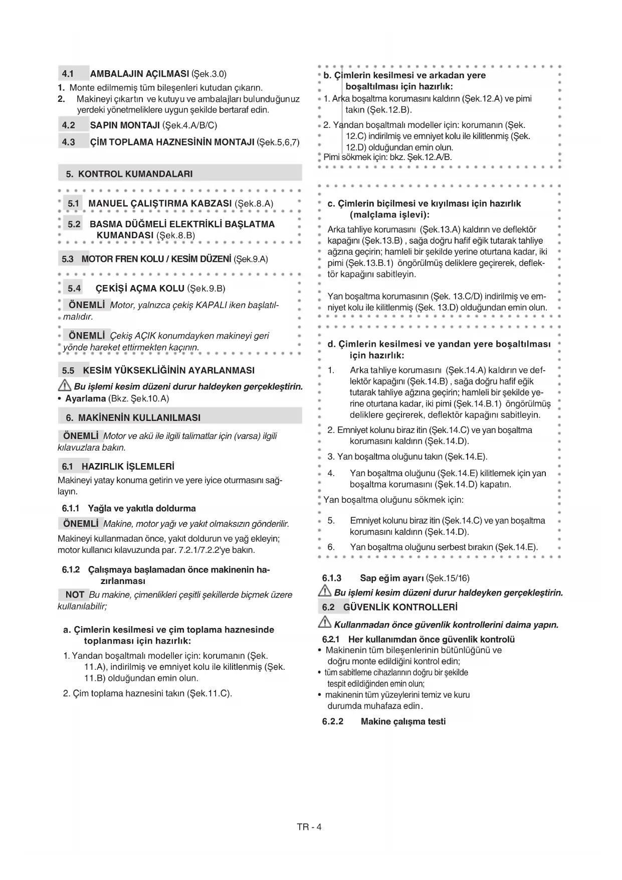 - Makineyi asla korumaları hasar görmüş, eksik veya yanlış monte edilmiş halde çalıştırmayın (çim toplama haznesi, yan boşaltma korumaları, arka boşaltma korumaları).