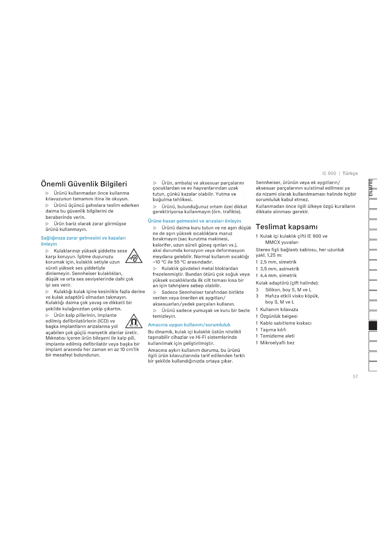 IE 900 | Türkçe Önemli Güvenlik Bilgileri ▷ Ürünü kullanmadan önce kullanma kılavuzunun tamamını itina ile okuyun. ▷ Ürünü üçüncü şahıslara teslim ederken daima bu güvenlik bilgilerini de beraberinde verin. ▷ Ürün bariz olarak zarar görmüşse ürünü kullanmayın. Sağlığınıza zarar gelmesini ve kazaları önleyin ▷ Kulaklarınızı yüksek şiddette sese karşı koruyun. İşitme duyunuzu korumak için, kulaklık setiyle uzun süreli yüksek ses şiddetiyle dinlemeyin. Sennheiser kulaklıkları, düşük ve orta ses seviyelerinde dahi çok iyi ses verir. ▷ Kulaklığı kulak içine kesinlikle fazla derine ve kulak adaptörü olmadan takmayın. Kulaklığı daima çok yavaş ve dikkatli bir şekilde kulağınızdan çekip çıkartın. ▷ Ürün kalp pillerinin, implante edilmiş defibrilatörlerin (ICD) ve başka implantların arızalarına yol açabilen çok güçlü manyetik alanlar üretir. Mıknatısı içeren ürün bileşeni ile kalp pili, implante edilmiş defibrilatör veya başka bir implant arasında her zaman en az 10 cm'lik bir mesafeyi bulundurun. ▷ Ürün, ambalaj ve aksesuar parçalarını çocuklardan ve ev hayvanlarından uzak tutun, çünkü kazalar olabilir. Yutma ve boğulma tehlikesi. ▷ Ürünü, bulunduğunuz ortam özel dikkat gerektiriyorsa kullanmayın (örn. trafikte). Ürüne hasar gelmesini ve arızaları önleyin ▷ Ürünü daima kuru tutun ve ne aşırı düşük ne de aşırı yüksek sıcaklıklara maruz bırakmayın (sac kurutma makinesi, kalorifer, uzun süreli güneş ışınları vs.), aksi durumda korozyon veya deformasyon meydana gelebilir. Normal kullanım sıcaklığı –10 °C ile 55 °C arasındadır. ▷ Kulaklık gövdeleri metal bloklardan frezelenmiştir. Bundan ötürü çok soğuk veya yüksek sıcaklıklarda ilk cilt teması kısa bir an için tahrişlere sebep olabilir. ▷ Sadece Sennheiser tarafından birlikte verilen veya önerilen ek aygıtları/ aksesuarları/yedek parçaları kullanın. ▷ Ürünü sadece yumuşak ve kuru bir bezle temizleyin. Amacına uygun kullanım/sorumluluk Bu dinamik, kulak içi kulaklık üstün nitelikli taşınabilir cihazlar ve Hi-Fi sistemlerinde kullanılmak için geliştirilmiştir. Amacına aykırı kullanım durumu, bu ürünü ilgili ürün kılavuzlarında tarif edilenden farklı bir şekilde kullandığınızda ortaya çıkar. Sennheiser, ürünün veya ek aygıtların/ aksesuar parçalarının suistimal edilmesi ya da nizami olarak kullanılmaması halinde hiçbir sorumluluk kabul etmez. Kullanmadan önce ilgili ülkeye özgü kuralların dikkate alınması gerekir. Teslimat kapsamı 1 Kulak içi kulaklık çifti IE 900 ve MMCX yuvaları Stereo fişli bağlantı kablosu, her uzunluk yakl. 1,25 m: 1 2,5 mm, simetrik 1 3,5 mm, asimetrik 1 4,4 mm, simetrik Kulak adaptörü (çift halinde): 3 Silikon, boy S, M ve L 3 Hafıza etkili visko köpük, boy S, M ve L 1 Kullanım kılavuzu 1 Özgünlük belgesi 1 Kablo sabitleme kıskacı 1 Taşıma kılıfı 1 Temizleme aleti 1 Mikroelyaflı bez58 Türkçe | IE 900 Sennheiser IE 900 Çok ince zevke sahip müzik dinleyicileri için ideal ses tınısını aramak sonu olmayan bir mükemmellik sevdasıdır. Bu tutkudan ilham alan IE 900 yeni Sennheiser kulak içi serisinin en iyi örneği olarak orijinal ses aktarımında yeni ölçütler yaratıyor. Zarif gövdesinden, başarılı 7-mm-XWB dönüştürücünün iyileştirilmiş versiyonu ile ses kanalının iletim özelliklerine varana dek: Geliştirme sırasında en küçük ayrıntılar bile gözden kaçırılmadan Sennheiser'in zengin akustik bilgileri bu kulak içi aygıtta işitilir duruma getirildi. Yeni akustik dizayn, yüksek frekanslardaki gücü harikulade doğal bir ses için optimize eden iyileştirilmiş bir vibrasyon bobinine sahiptir. Doğal rezonanslar ve armonik distorsiyonlar optimum bir diyafram zarıyla en aza indirgenir. Çok sayıdaki bu rötuşların sonucunda, en titiz ses tutkunlarını ödüllendirmek için olağanüstü doğallıkta bir ses yayını elde edilir. IE 900 Almanya'daki Sennheiser firmasının ana tesisinde en sıkı üretim toleranslarına uyularak bir uzmanlar ekibince üretilmektedir. Her ses dönüştürücüsü iki defa tamamıyla test edilir – sağ ve sol kulaklık taraflarının çiftleştirilmesinden önce hem tek tek, hem de sonrasında birlikte olarak. Sağ ve sol tarafların ses dönüştürücüleri en iyi şekilde birbirine uyumlu olmak için seçilir. Detaya gösterilen bu ilgi ayrıca profesyonel sesten esinlenen seçkin dizaynda da görülüyor. Her gövde tek bir üstün kalite alüminyum bloktan hassas bir biçimde frezelenerek, en yüksek ses kalitesi ve aynı zamanda olağandışı bir dayanım garanti edilir. Bunların yanı sıra IE 900 üstün kaliteli Fidelity