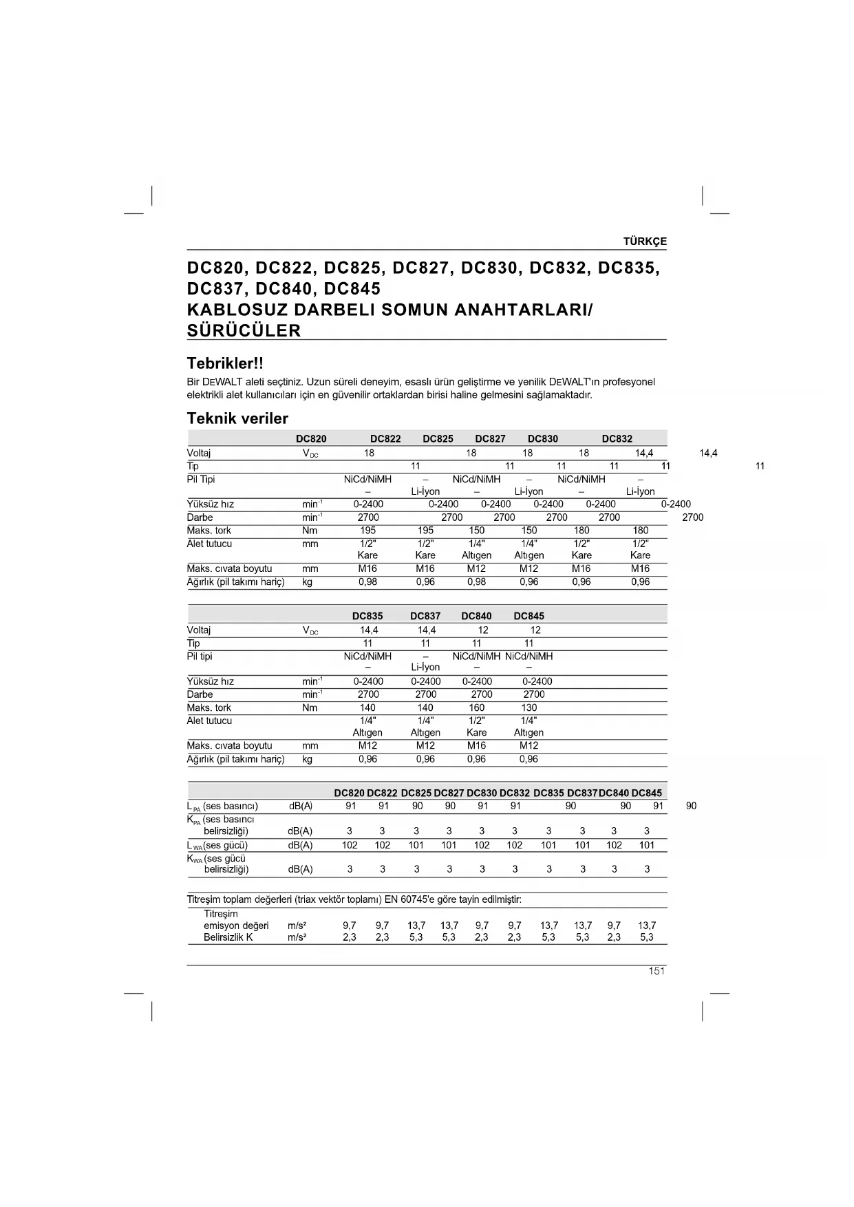 Tebrikler!! Bir DEWALT aleti seçtiniz. Uzun süreli deneyim, esaslı ürün geliştirme ve yenilik DEWALT'ın profesyonel elektrikli alet kullanıcıları için en güvenilir ortaklardan birisi haline gelmesini sağlamaktadır. Teknik veriler DC820 DC822 DC825 DC827 DC830 DC832 Voltaj V