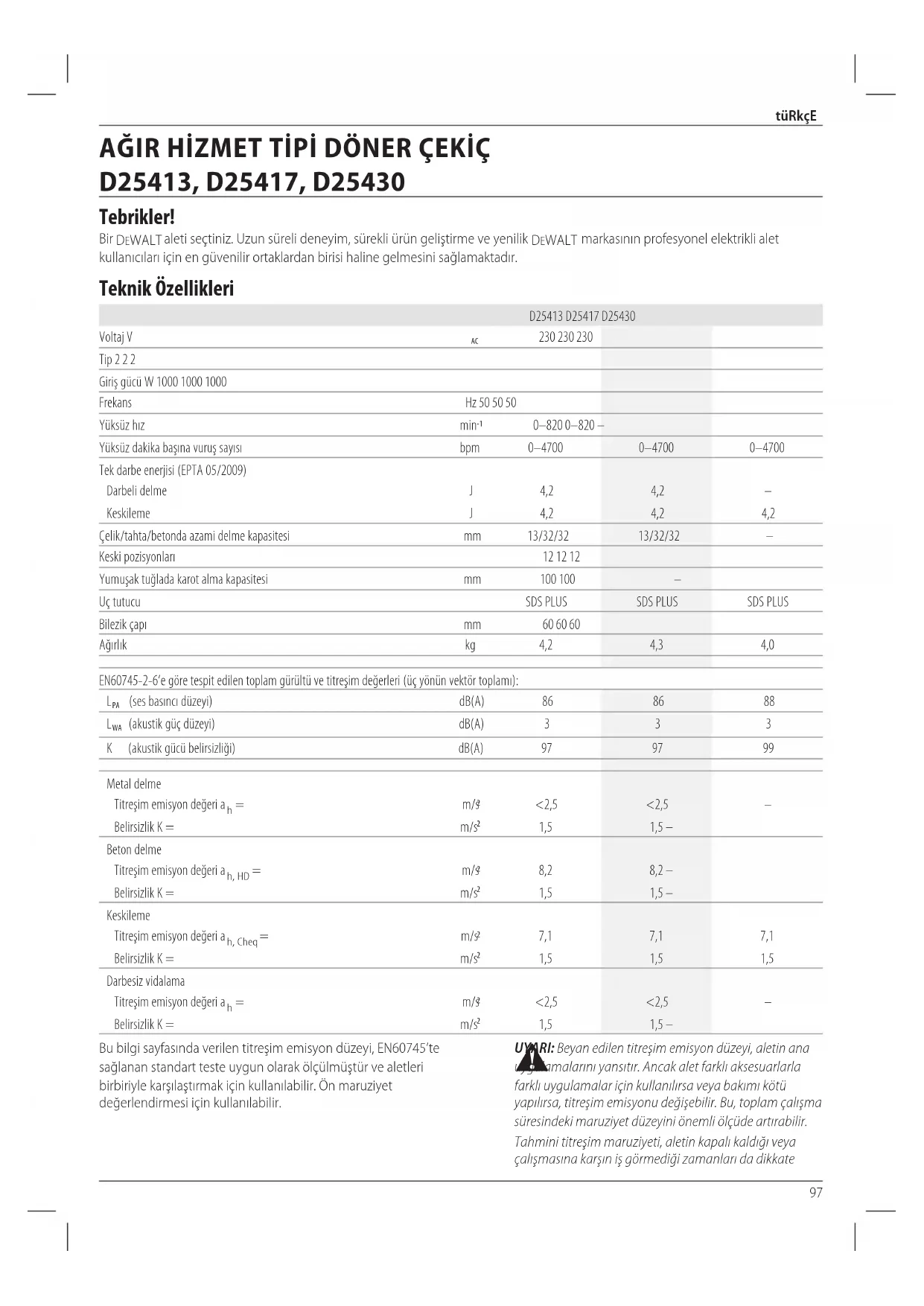 UYARI: Beyan edilen titreşim emisyon düzeyi, aletin ana uygulamalarını yansıtır. Ancak alet farklı aksesuarlarla farklı uygulamalar için kullanılırsa veya bakımı kötü yapılırsa, titreşim emisyonu değişebilir. Bu, toplam çalışma süresindeki maruziyet düzeyini önemli ölçüdeartırabilir. Tahmini titreşim maruziyeti, aletin kapalı kaldığı veya çalışmasına karşın iş görmediği zamanları da dikkate Bu bilgi sayfasında verilen titreşim emisyon düzeyi, EN60745’te sağlanan standart teste uygun olarak ölçülmüştür ve aletleri birbiriyle karşılaştırmak için kullanılabilir. Ön maruziyet değerlendirmesi içinkullanılabilir. Türkçe (orijinal talimatlardan çevrilmiştir) AĞIR HİZMET TİPİ DÖNER ÇEKİÇ D25413, D25417, D25430 Tebrikler! Bir DeWALT aleti seçtiniz. Uzun süreli deneyim, sürekli ürün geliştirme ve yenilik DeWALT markasının profesyonel elektrikli alet kullanıcıları için en güvenilir ortaklardan birisi haline gelmesinisağlamaktadır. Teknik Özellikleri D25413 D25417 D25430 Voltaj V