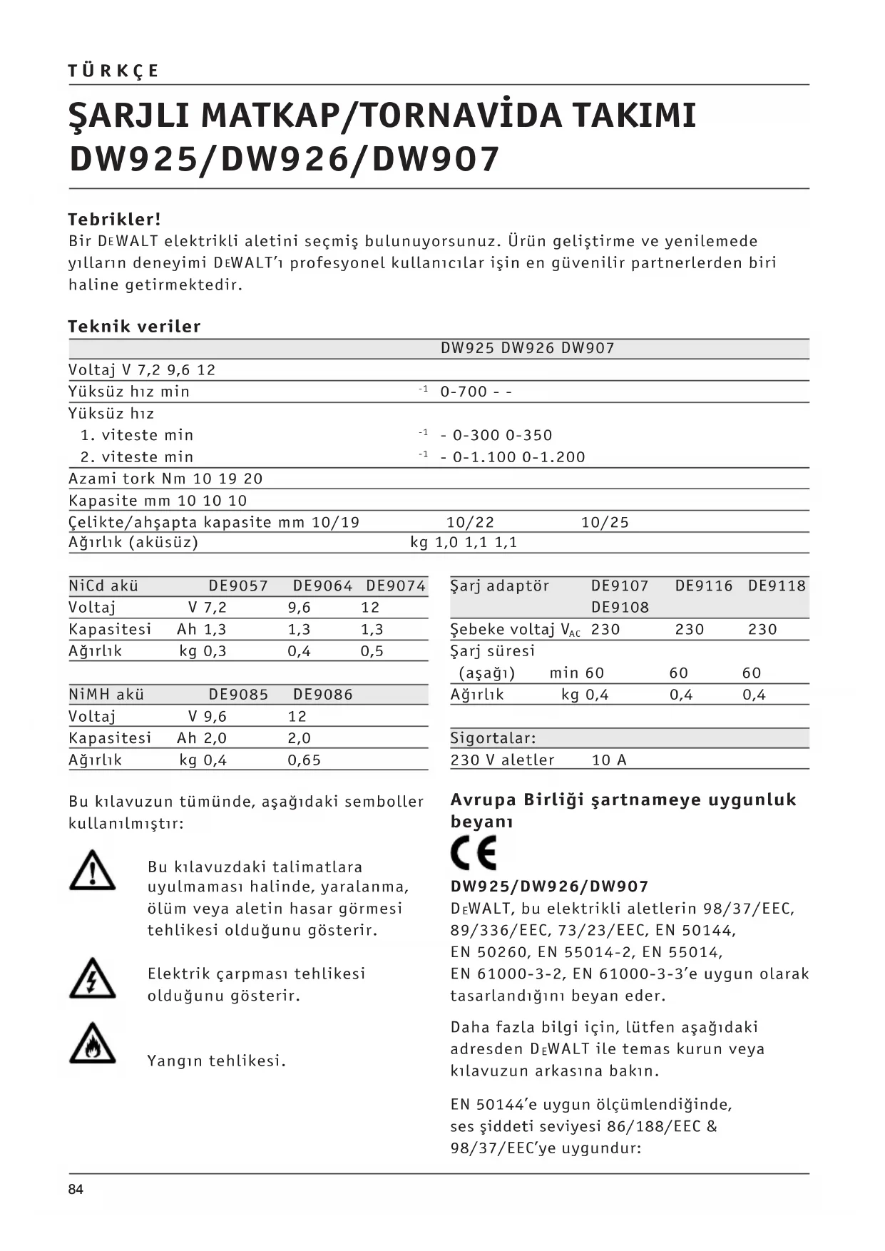 WALT, bu elektrikli aletlerin 98/37/EEC, 89/336/EEC, 73/23/EEC, EN 50144, EN 50260, EN 55014-2, EN 55014, EN 61000-3-2, EN 61000-3-3’e uygun olarak tasarlandğn beyan eder. Daha fazla bilgi için, lütfen aşağdaki adresden D