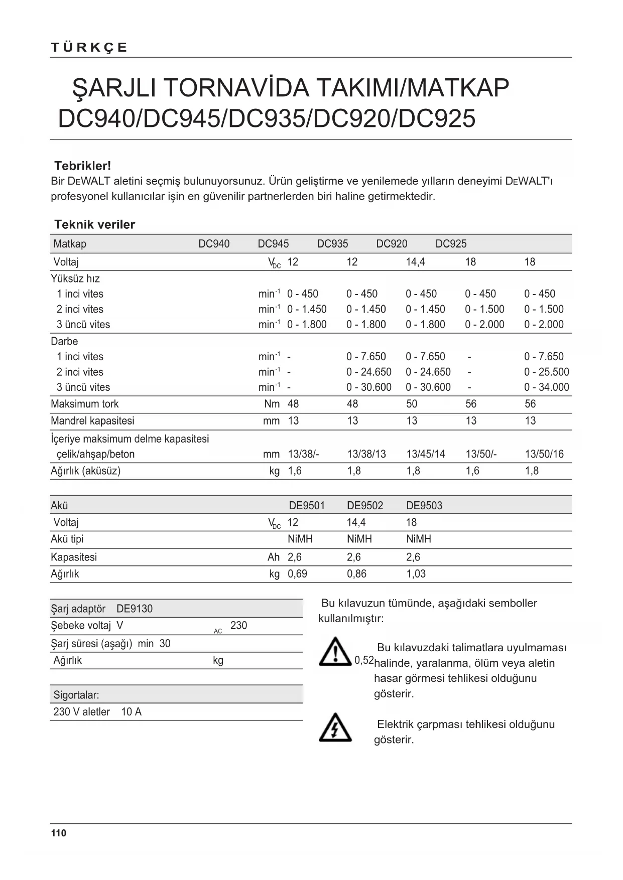 Tebrikler! Bir D E WALT aletini seçmiş bulunuyorsunuz. Ürün geliştirme ve yenilemede yılların deneyimi D E WALT'ı profesyonel kullanıcılar işin en güvenilir partnerlerden biri haline getirmektedir. Teknik veriler Matkap DC940 DC945 DC935 DC920 DC925 Voltaj V 12 12 14,4 18 18 Yüksüz hız 1 inci vites min