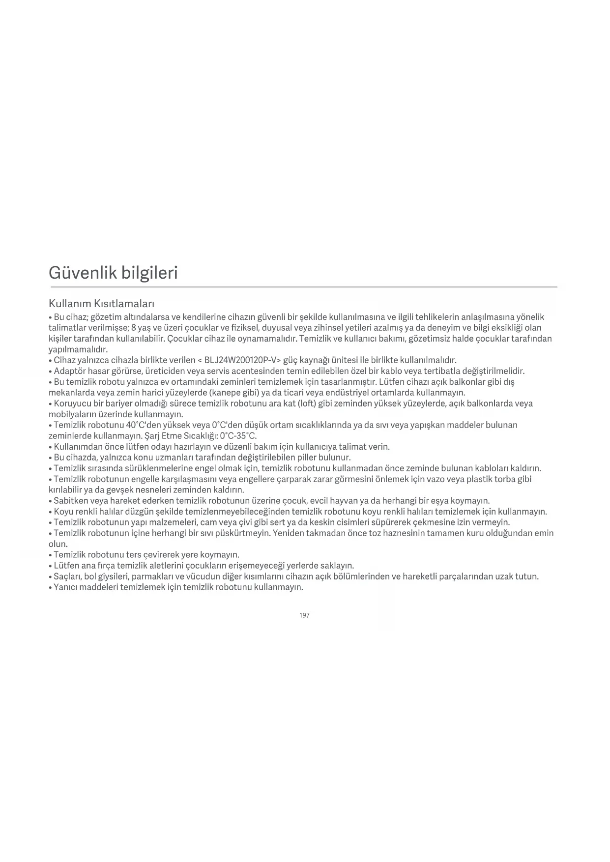 - Yanıcı maddeleri temizlemek için temizlik robotunu kullanmayın. 197• Normal koşullar altında, bu ekipman için anten ile kullanıcı arasında en az 20 cm'lik bir mesafe bırakılmalıdır.