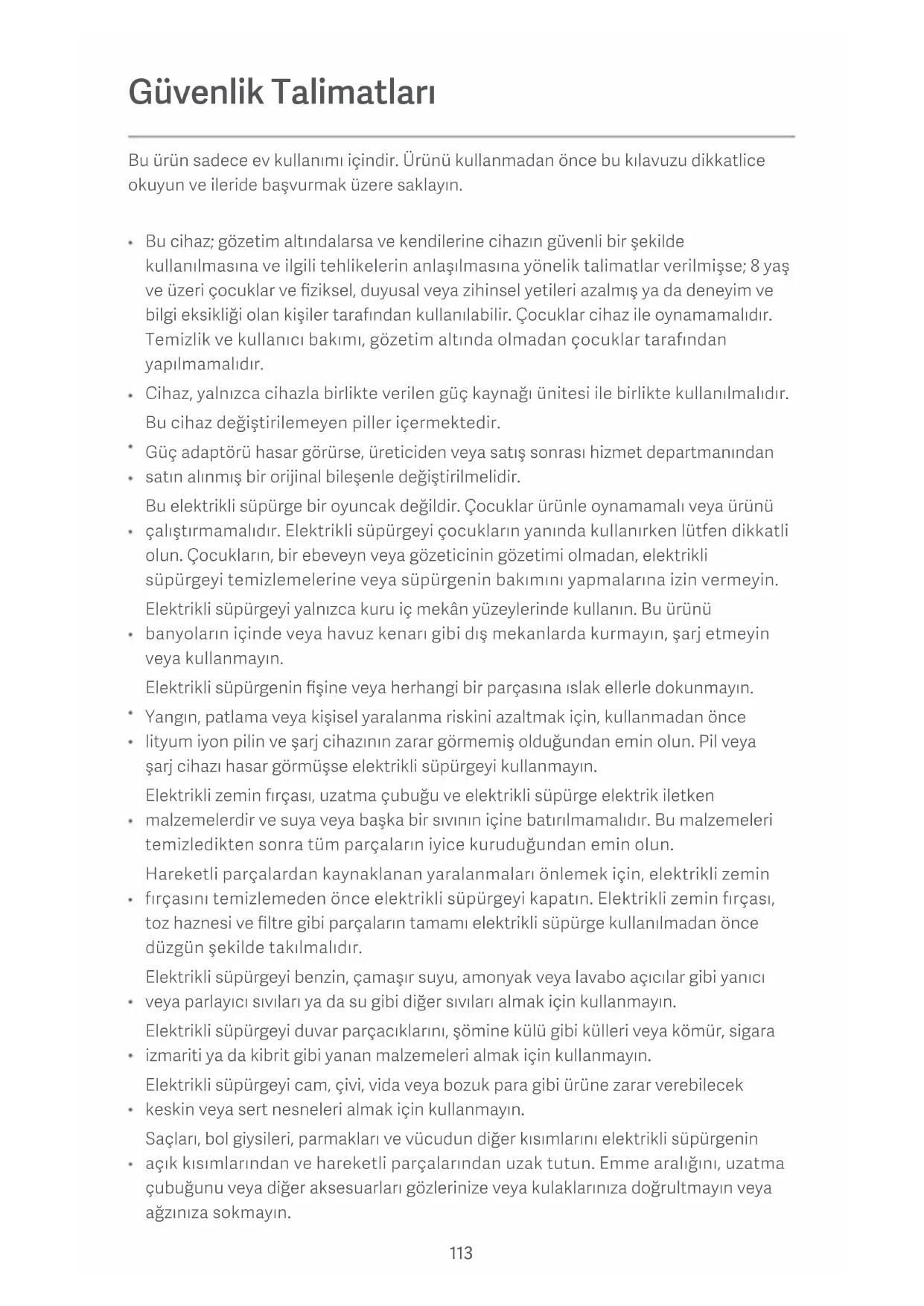 Odkurzacz znajduje się w trybie gotowości i nie można go używać podczas ładowania. Akumulator litowo-jonowy zawiera substancje niebezpieczne dla środowiska. Przed utylizacją odkurzacza należy najpierw wyjąć akumulator, a następnie zutylizować go lub poddać recyklingowi zgodnie z lokalnymi przepisami i regulacjami prawnymi kraju lub regionu, w którym jest używany. Uwaga: Przed wyjęciem akumulatora należy wyłączyć odkurzacz. Akumulator należy bezpiecznie wycofać z eksploatacji.113 Güvenlik Talimatları Bu ürün sadece ev kullanımı içindir. Ürünü kullanmadan önce bu kılavuzu dikkatlice okuyun ve ileride başvurmak üzere saklayın. Bu cihaz; gözetim altındalarsa ve kendilerine cihazın güvenli bir şekilde kullanılmasına ve ilgili tehlikelerin anlaşılmasına yönelik talimatlar verilmişse; 8 yaş ve üzeri çocuklar ve fiziksel, duyusal veya zihinsel yetileri azalmış ya da deneyim ve bilgi eksikliği olan kişiler tarafından kullanılabilir. Çocuklar cihaz ile oynamamalıdır. Temizlik ve kullanıcı bakımı, gözetim altında olmadan çocuklar tarafından yapılmamalıdır. Cihaz, yalnızca cihazla birlikte verilen güç kaynağı ünitesi ile birlikte kullanılmalıdır. Bu cihaz değiştirilemeyen piller içermektedir. Güç adaptörü hasar görürse, üreticiden veya satış sonrası hizmet departmanından satın alınmış bir orijinal bileşenle değiştirilmelidir. Bu elektrikli süpürge bir oyuncak değildir. Çocuklar ürünle oynamamalı veya ürünü çalıştırmamalıdır. Elektrikli süpürgeyi çocukların yanında kullanırken lütfen dikkatli olun. Çocukların, bir ebeveyn veya gözeticinin gözetimi olmadan, elektrikli süpürgeyi temizlemelerine veya süpürgenin bakımını yapmalarına izin vermeyin. Elektrikli süpürgeyi yalnızca kuru iç mekân yüzeylerinde kullanın. Bu ürünü banyoların içinde veya havuz kenarı gibi dış mekanlarda kurmayın, şarj etmeyin veya kullanmayın. Elektrikli süpürgenin fişine veya herhangi bir parçasına ıslak ellerle dokunmayın. Yangın, patlama veya kişisel yaralanma riskini azaltmak için, kullanmadan önce lityum iyon pilin ve şarj cihazının zarar görmemiş olduğundan emin olun. Pil veya şarj cihazı hasar görmüşse elektrikli süpürgeyi kullanmayın. Elektrikli zemin fırçası, uzatma çubuğu ve elektrikli süpürge elektrik iletken malzemelerdir ve suya veya başka bir sıvının içine batırılmamalıdır. Bu malzemeleri temizledikten sonra tüm parçaların iyice kuruduğundan emin olun. Hareketli parçalardan kaynaklanan yaralanmaları önlemek için, elektrikli zemin fırçasını temizlemeden önce elektrikli süpürgeyi kapatın. Elektrikli zemin fırçası, toz haznesi ve filtre gibi parçaların tamamı elektrikli süpürge kullanılmadan önce düzgün şekilde takılmalıdır. Elektrikli süpürgeyi benzin, çamaşır suyu, amonyak veya lavabo açıcılar gibi yanıcı veya parlayıcı sıvıları ya da su gibi diğer sıvıları almak için kullanmayın. Elektrikli süpürgeyi duvar parçacıklarını, şömine külü gibi külleri veya kömür, sigara izmariti ya da kibrit gibi yanan malzemeleri almak için kullanmayın. Elektrikli süpürgeyi cam, çivi, vida veya bozuk para gibi ürüne zarar verebilecek keskin veya sert nesneleri almak için kullanmayın. Saçları, bol giysileri, parmakları ve vücudun diğer kısımlarını elektrikli süpürgenin açık kısımlarından ve hareketli parçalarından uzak tutun. Emme aralığını, uzatma çubuğunu veya diğer aksesuarları gözlerinize veya kulaklarınıza doğrultmayın veya ağzınıza sokmayın.114 Guangdong Deerma Technology Co., Ltd. olarak işbu belge ile bu ekipmanın geçerli Direktiflere, Avrupa Normlarına ve değişikliklere uygun olduğunu beyan ederiz. AB uygunluk beyanının tam metnine şu adresten ulaşılabilir: hp://www.mi.com/global/service/support/declaration.html Elektrikli süpürgenin açık kısımlarına herhangi bir nesne sokmayın veya açık kısımları tıkanmışken elektrikli süpürgeyi kullanmayın. Hava akışını azaltabilecek toz, tüy, saç veya diğer maddelerden uzak tutun. Elektrikli süpürgeyi bir sandalyeye, masaya veya diğer dengesiz yüzeylere yaslamayın çünkü böyle yapmak ürüne zarar verebilir veya kişisel yaralanmalara neden olabilir. Elektrikli süpürge, devrildiği veya hasar gördüğü için arızalanırsa, lütfen yetkili servis departmanı ile iletişime geçin. Elektrikli süpürgeyi asla kendi başınıza sökmeye çalışmayın. Ürünü 0 °C ila 35 °C ortam sıcaklığına sahip ortamlarda şarj etmek için yalnızca orijinal şarj cihazını kullanın. Aksi takdirde pil zarar görebilir. Elektrikli süpürge kullanılmadan önce toz haznesi, filtre pamuğu, siklon ayırıcı ve filtre gibi parçaların tamamı düzgün şekilde takılmalıdır. Uzun süre kullanılmadığında ve ayrıca herhangi bir bakım veya onarım gerçekleştirmeden önce, elektrikli süpürgenin fişinin takılı olmadığından emin olun. Merdivenleri temizlemek için elektrikli süpürgeyi kullanırken lütfen çok dikkatli olun. UYARI: Elektrikli süpürgenin filtresine herhangi bir tür koku uygulamayın. Bu tür ürünlerin, elektrikli süpürgenin alev almasına neden olabilecek yanıcı kimyasallar içerdiği bilinmektedir. Patlamaya neden olabileceği için cihazı ateşe maruz BIRAKMAYIN. Cihazı herhangi bir su, tuzlu su veya diğer sıvılara maruz BIRAKMAYIN veya içine BATIRMAYIN. Elektrikli süpürgeyi kullanırken bu kullanım kılavuzundaki talimatları lütfen sıkı sıkıya takip edin. Elektrikli süpürgenin yanlış kullanımından kaynaklanabilecek herhangi bir kayıp veya hasardan kullanıcılar sorumludur.Paket İçeriği Yüksek hızlı fırçasız bir motorla donatılmış olan Mi Hafif Elektrikli Süpürge, güçlü emiş ve yüksek verimli bir filtreleme sistemi gibi üstün özelliklere sahiptir. Yüksek hızlı f