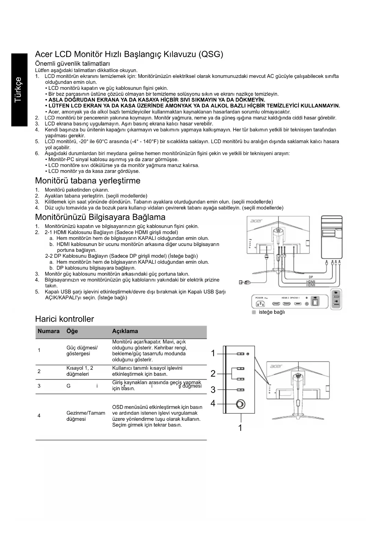 Kontrast 100.000.000:1 Maks (ACM) Görülebilir Açı 178° (Y) 178° (D) (CR=10) Tepki Süresi 1 ms (G - G) / 0,5 ms (G - G, En Düşük) Panel Türü In-Plane Switching Yatay Frekans 31 - 308 kHz Dikey Frekans 56 - 280 Hz Ekran Renkleri 16,7 Milyon Dot Clock 650 MHz Maksimum Çözünürlük HDMI/DP: 1920 x 1080 @ 240 Hz DP: 1920 x 1080 @ 280 Hz (Hız Aşırtma AÇMA olarak) Tak ve Kullan VESA DDCCI/DDC2B Enerji Verimliliği Sınıfı B *Yıllık Enerji Tüketimi 39 (kWh) (HDMI girişli Modeli İçin) Güç Tüketimi (200 nit’te) Açık Mod 22,0 W (Tipik) Uyku Modu 0,45 W (Tipik) Kapalı Mod 0,25 W (Tipik) Giriş Bağlayıcısı HDMI (Sadece HDMI Girişli Model) DP (Sadece DP Girişli Model) Giriş Video Sinyali HDMI (Sadece HDMI Girişli Model) (İsteğe bağlı) DP (Sadece DP Girişli Model) (İsteğe bağlı) Hoparlörler 2 W x 2 (Sadece Ses Girişli Model) (İsteğe bağlı) USB USB 3.0 x 2 (İsteğe Ba ğlı) Maksimum Ekran Büyüklüğü Yatay: 543,744 mm Dikey: 302,616 mm Güç Kaynağı 100 - 240 V, 50/60 Hz Çevresel Durumlar Çalışma Sıcaklığı: 0° - 40°C Saklama Sıcaklığı: -20° - 60°C Çalışma Nem Aralığı: %20 - %80 Boyutlar 557,79 (G) x 397,84 ~ 512,84 (Y) x 236,27 (D) mm Ağırlık (Net) 5,30 kg (net) Mekanizma Teknik Özellikleri Eğim: -5° - +25° (Yükselme açısı için sadece en yüksek noktada 25 derecelik yaslanma sunulabilir) Dönüş: -20° - +20° Boy ayarlaması: 0 mm - 115 mm Pivot: -90° - +90° Ayrılabilir ayak noktası: Evet Harici kontroller Anahtar/Düğmeler Güç Düğmesi Kısayol 1 Kısayol 2 Giriş Menü/Gezinme/Tamam İşlevler Parlaklık Kontrast Mavi Işık Siyah Güçlendir ACM HDR Süper Netlik Gamma Renk Sıcaklığı Modlar Renk Alanı Gri Tonlama Modu 6 eks. Ton 6 eks. Doygun. Ses Seviyesi Sessiz Aşır ı Hız Adaptive-Sync Yenileme hızı VRB Son Derece Düşük Gecikme Hedef nokta Dil OSD Zaman Aşımı Şeffaflık Menü Kilidi Giriş Ortam Işığı Otomatik Kaynak DP Formatı Kısayol Atama Geniş Mod DDC/CI HDMI Siyah düzey Hızlı Başlt Modu Hız Aşırtma# Güç Kapalı USB Şarjı Ekran Bilgisi Tüm Ayarları Sıfırla Çıkış Teknik özellikler, modele ve/veya bölgeye göre değişiklik gösterir.Română Ghid de iniţiere rapidă pentru monitorul LCD Acer (QSG) Instrucţiuni de siguranţă importante Vă rugăm să citiţi cu atenţie instrucţiunile următoare. 1. Pentru a curăţa ecranul monitorului LCD: Verificaţi dacă monitorul are parametri electrici corespunzători alimentării cu c.a. disponibile în locaţia dvs.