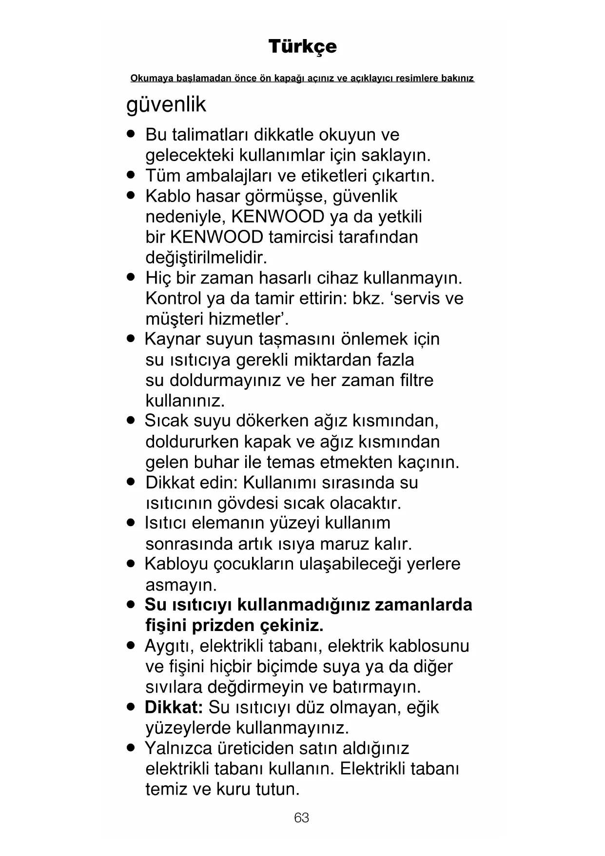 Fiziki, algılama veya zihinsel yetersizliği olan kişiler ya da bu cihazı kullanmayı bilmeyen kişiler denetim altında kullanmalı veya güvenli kullanımı hakkında bilgilendirilmeli ve olası tehlikeler öğretilmelidir.65 English fişe takmadan önce Elekt rik te si sa t› n› z›n sa¤ la d› ¤› ak› m›n cihaz ta ba n›n da ya z› lan de ¤er le ay n› ol ma s› na dik kat edin. UYARI: BU CİHAZ TOPRAKLANMALIDIR. Bu cihaz gıda ile temas eden malzemeler ve maddeler ile ilgili EC 1935/2004 Yönetmeliğine uygundur. ilk Kul la nım dan Ön ce1 Kablo fazlalığını güç tabanının altındaki brakete sarın.2 ‘MAX’ ifla re ti ne ka dar su dol du rup kay na t›n. Son ra bu su yu dö kün. 3 kez tekrarlayın. parçalar a kapakb açma/kapama düğmesic 360° dönüşlü güç tabanıd güç açık ışığıe kordon sarıcıf filtreA su se vi ye si gös ter ge si su ısıtıcınızın kullanımı 1 Hazneyi çıkararak ısıtıcıyı doldurun. Su seviyesi, ısıtıcının içerisinde yer alan su seviyesi göstergesinde (A) ‘MAX’ ve ‘MIN’ (250 ml) arasında olmalıdır. Eğer sert suların olduğu bir bölgede yaşıyorsanız, su ısıtıcınızın görünüm ve verimliliğinin korunması için filtre edilmiş su kullanmanızı öneririz. Ta sar ruf edin: ih ti ya c› n›z dan faz la su kay nat ma y›n. Kullanaca¤ınız suyun kalitesini yükseltmek için her zaman temiz su kullanın. Her kullanımdan sonra su ısıtıcının içindeki suyu boflaltın. Su ısıtıcısı 2 günden uzun süre kullanılmadığında temiz su ile çalkalayın2 Kapağın doğru şekilde takıldığından emin olun.3 Aygıtın fi…ini prize takınız ve çalı…tırmaya ba…layınız. Güç açık ışığı d yanacaktır. 4 Cihaz, su yu kay nat t›k tan son ra ken di li ¤in den ka pa na cak t›r. Su yu tek rar kay nat mak için bir kaç sa ni-ye bek le yin - aç/ka pa dü¤ me si-nin ha z›r ha le gel me si için bi raz za man geç me si gerekmektedir. Not – Kaynatmayı kesmek için güç tabanından çıkartmadan önce güç anahtarının kapalı konumda olduğundan emin olun. Kullanım sırasında su ısıtıcıyı açıp kaparken ya da kaynamadan önce su ısıtıcıyı kapatırken herhangi bir sorunla kar…ıla…ıyorsanız, yassı biçimli ısıtma donatısının kireçlenmi… olup olmadıòını kontrol ediniz. Bunun için “kireç giderme” bölümüne bakınız. Su ısıtıcınızda kireç partiküllerini tutacak bir filtre bulunmaktadır. Cihaz›n›z›n al t›n da su dam la la r› gö rür se niz en di fle len me yin - Bu sa de ce so ¤u yan su bu ha r› d›r.