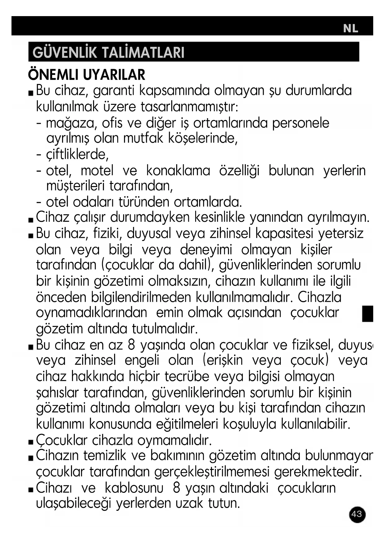 ÖNEMLI UYARILAR Bu cihaz, garanti kapsamında olmayan şu durumlarda kullanılmak üzere tasarlanmamıştır: - mağaza, ofis ve diğer iş ortamlarında personele ayrılmış olan mutfak köşelerinde, - çiftliklerde, - otel, motel ve konaklama özelliği bulunan yerlerin müşterileri tarafından, - otel odaları türünden ortamlarda. Cihaz çalışır durumdayken kesinlikle yanından ayrılmayın. Bu cihaz, fiziki, duyusal veya zihinsel kapasitesi yetersiz olan veya bilgi veya deneyimi olmayan kişiler tarafından (çocuklar da dahil), güvenliklerinden sorumlu bir kişinin gözetimi olmaksızın, cihazın kullanımı ile ilgili önceden bilgilendirilmeden kullanılmamalıdır. Cihazla oynamadıklarından emin olmak açısından çocuklar gözetim altında tutulmalıdır. Bu cihaz en az 8 yaşında olan çocuklar ve fiziksel, duyusal veya zihinsel engeli olan (erişkin veya çocuk) veya cihaz hakkında hiçbir tecrübe veya bilgisi olmayan şahıslar tarafından, güvenliklerinden sorumlu bir kişinin gözetimi altında olmaları veya bu kişi tarafından cihazın kullanımı konusunda eğitilmeleri koşuluyla kullanılabilir. Çocuklar cihazla oymamalıdır. Cihazın temizlik ve bakımının gözetim altında bulunmayan çocuklar tarafından gerçekleştirilmemesi gerekmektedir. Cihazı ve kablosunu 8 yaşın altındaki çocukların ulaşabileceği yerlerden uzak tutun.