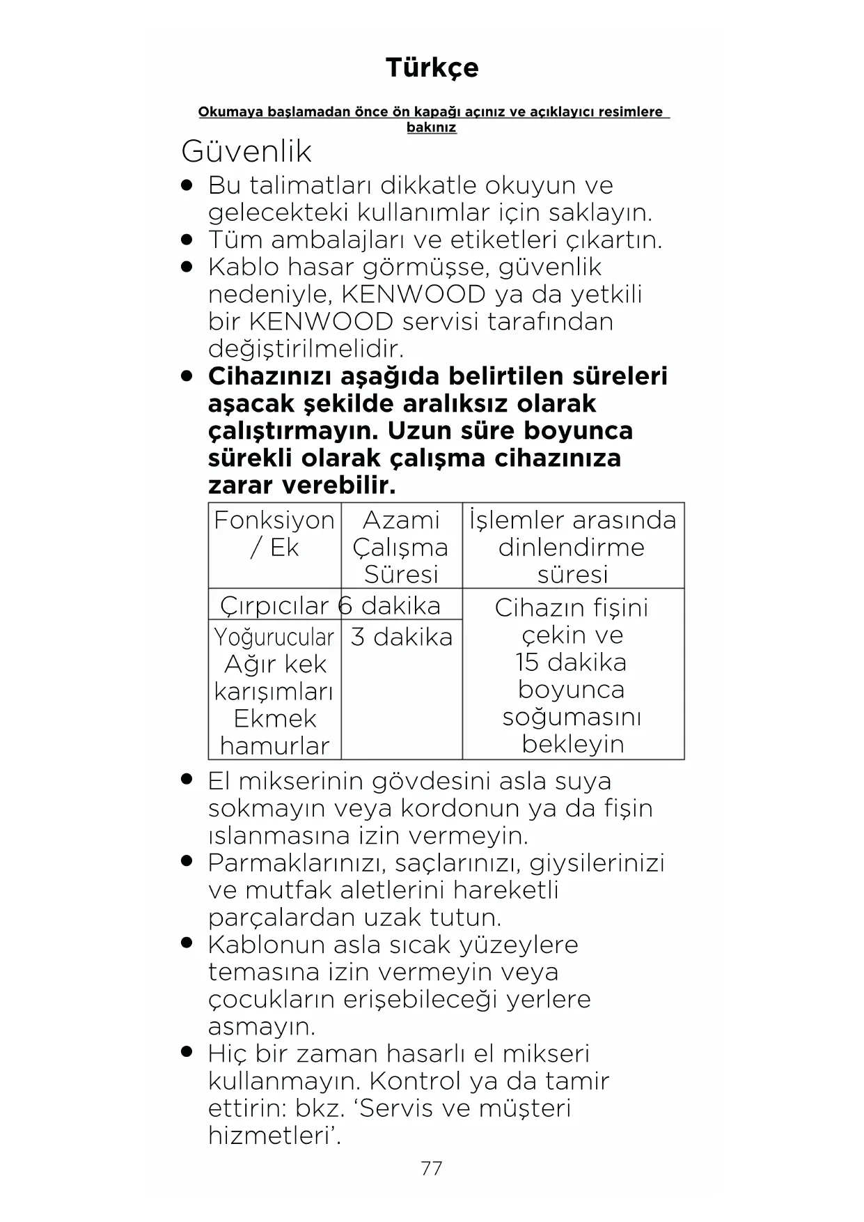 Hiç bir zaman hasarlı el mikseri kullanmayın. Kontrol ya da tamir ettirin: bkz. ‘Servis ve müşteri hizmetleri’. Okumaya başlamadan önce ön kapağı açınız ve açıklayıcı resimlere bakınız Türkçe78
