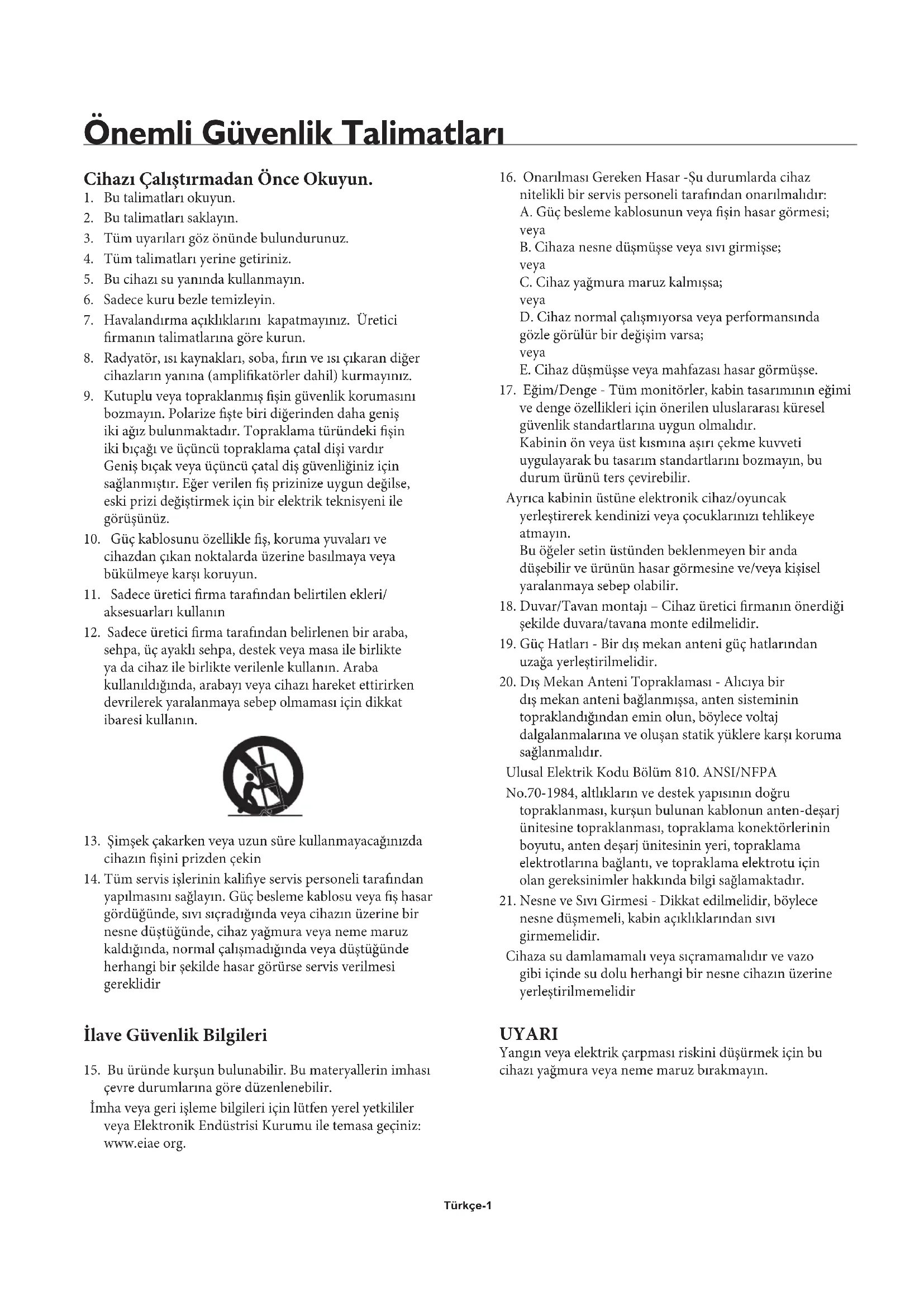 nesne düşmemeli, kabin açıklıklarından sıvı girmemelidir. Cihaza su damlamamalı veya sıçramamalıdır ve vazo gibi içinde su dolu herhangi bir nesne cihazın üzerine yerleştirilmemelidir UYARI Yangın veya elektrik çarpması riskini düşürmek için bu cihazı yağmura veya neme maruz bırakmayın.Türkçe-2 Önemli Bilgi Uyarı YANGIN VEYA ELEKTRİK ÇARPMA TEHLİKESİNİ ÖNLEMEK İÇİN BU ÜNİTEYİ YAĞMURA VEYA NEME MARUZ BIRAKMAYIN. ÜÇLÜ DİŞLER TAM OLARAK TAKILINCAYA KADAR BU ÜNİTENİN POLARİZE FİŞİNİ UZATMA KABLOSUNUN YUVASI VEYA DİĞER PRİZLER İLE BİRLİKTE KULLANMAYIN UNLESS THE PRONGS CAN BE FULLY INSERTED. KABİNİ AÇMAYIN, İÇ KISIMDA YÜKSEK VOLTAJLI PARÇALAR BULUNMAKTADIR. ONARIM İŞLEMİNİ NİTELİKLİ SERVİS PERSONELİNE YAPTIRIN. DıkkaT DİKKAT