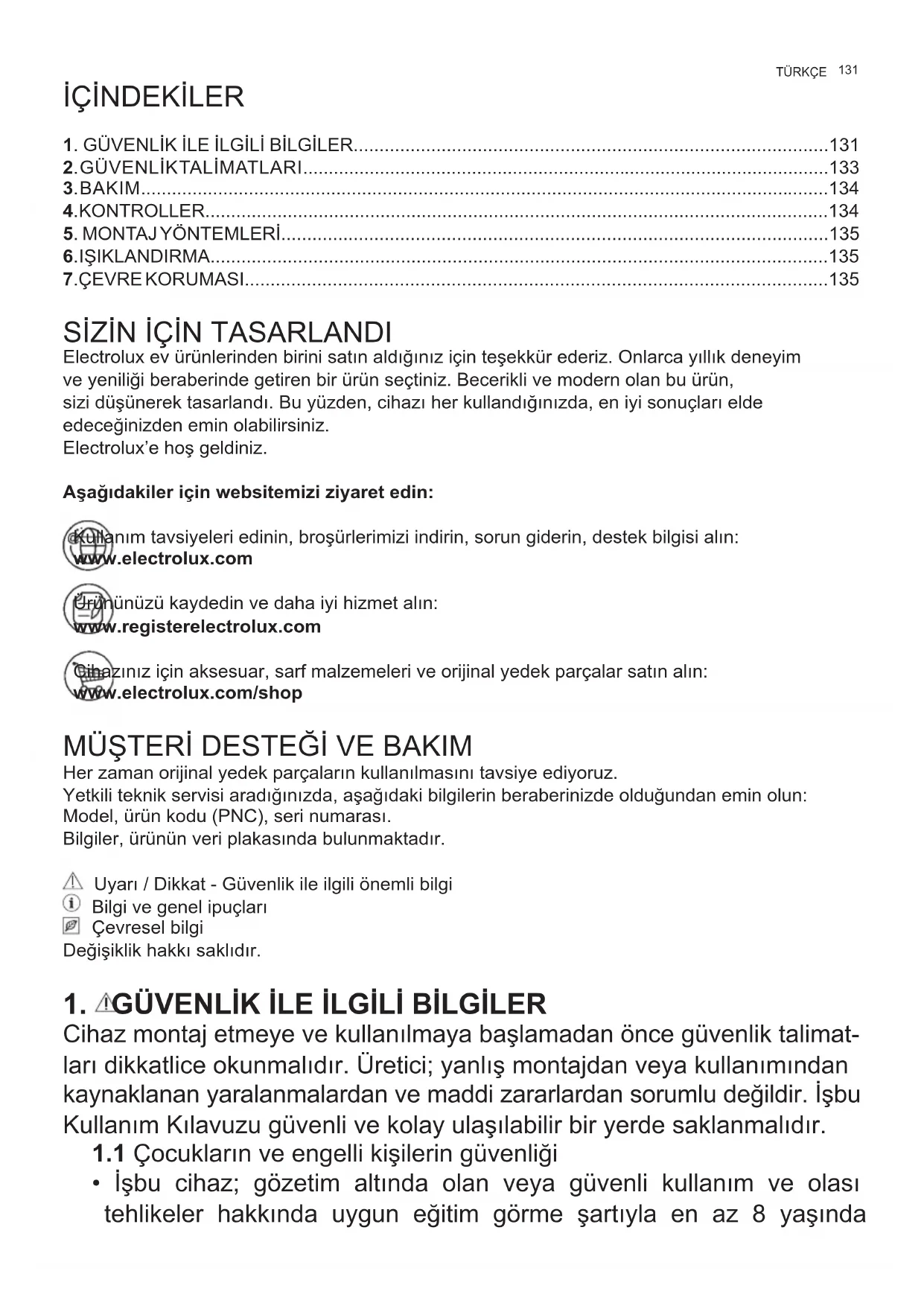 - İşbu cihaz; gözetim altında olan veya güvenli kullanım ve olası tehlikeler hakkında uygun eğitim görme şartıyla en az 8 yaşında TÜRKÇE132 www.electrolux.com çocuklar, sınırlı fi ziksel, duyusal ve zihinsel yeteneklere sahip kişiler veya yeterli deneyime ve bilgiye sahip olmayan kişiler tarafından kullanılabilir.