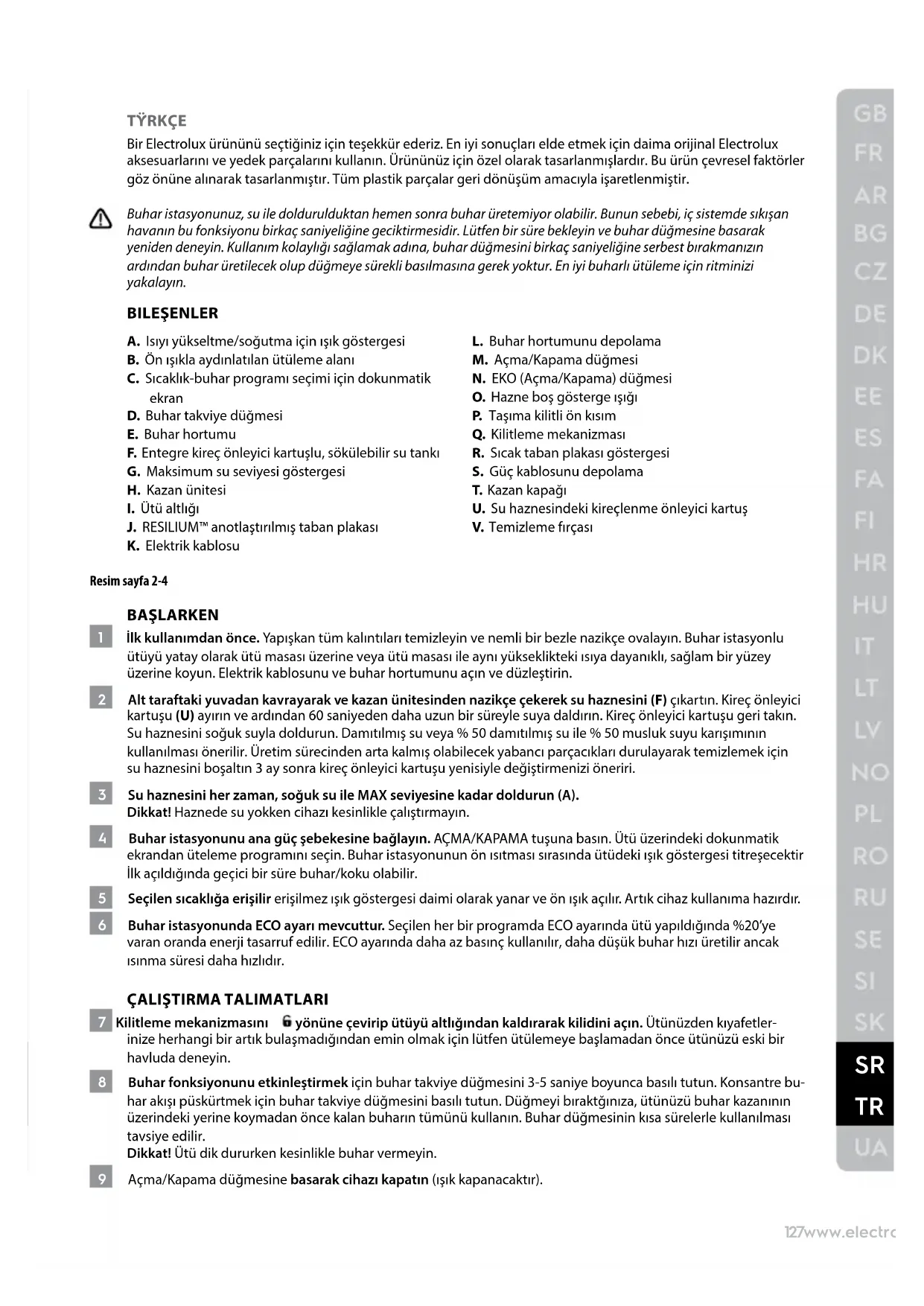 7 Kilitleme mekanizmasını yönüne çevirip ütüyü altlığından kaldırarak kilidini açın. Ütünüzden kıyafetler- inize herhangi bir artık bulaşmadığından emin olmak için lütfen ütülemeye başlamadan önce ütünüzü eski bir havluda deneyin. 8 Buhar fonksiyonunu etkinleştirmek için buhar takviye düğmesini 3-5 saniye boyunca basılı tutun. Konsantre bu- har akışı püskürtmek için buhar takviye düğmesini basılı tutun. Düğmeyi bıraktğınıza, ütünüzü buhar kazanının üzerindeki yerine koymadan önce kalan buharın tümünü kullanın. Buhar düğmesinin kısa sürelerle kullanılması tavsiye edilir. Dikkat! Ütü dik dururken kesinlikle buhar vermeyin. 9 Açma/Kapama düğmesine basarak cihazı kapatın (ışık kapanacaktır).128 www.electrolux.com 10 Ütüyü kaldırmadan önce her zaman altlığında bekleterek tamamen soğumasına izin verin. Ütü soğuduğunda, su haznesini boşaltın. Buhar istasyonlu ütüyü, ütü altlığının üzerinde saklayın 11 Cihazı kullanmayı bitirdiğinizde Açma/Kapama düğmesine basarak cihazı kapat. Ütüyü, ütü altlığının üzerine yerleştirin ve sabitlemek için de kilitleme mekanizmasını yönünde çevirin. 12 Elektrik kablosunu her zaman elektrik kablosu depolama alanında (S) ve buhar hortumunu da buhar ista- syonu tabanındaki buhar hortumu depolama alanında (L) saklayın. Uyarı! Elektrik kablosunu ASLA ütünün etrafına sarmayın. TEMIZLEME 13 İstasyon tabanını yana çevirerek kazan kapağını en üste getirin. Kazan kapağını sökün. Cihazı bir lavaboda yan yatırın ve kazanı tamamen boşaltın. 14 Kireç çözücü maddeyle suyu belirtilen oranda karıştırarak en az 300 ml’lik bir kireç çözücü karışım hazırlayın. (Karışım için önerilen oranı kullanın Çok fazla kireçlenme varsa, kireç çözücünün oranını doğru bir şekilde artırın.) Not: Electrolux tarafından sunulan EUD5 kireç çözücünün kullanılmasınıtavsiye ederiz. Lütfen şişe üzerindeki su/ kireç çözücü sıvı oranı talimatlarına uyun.Ürünü 2 ayda bir temizlemenizi tavsiye ederiz. 15 Karışımı boşaltın. Kazanı temiz suyla doldurun ve ardından boşaltın. Kireç temizlenene ve kireç sökücü kokusu kalmayana kadar bu adımı birkaç kere tekrarlayın. Yeniden takmadan önce kazana bir ölçü kabı temiz su koyun. KİRECE BAĞLI OLUŞAN TIKANMADAN KAYNAKLANAN HASARLAR, GARANTİ KAPSAMINDA DEĞİLDİR. Temi- zleme işleminden sonra, brülörü tamamen boşaltmayın. İçinde bir miktar su bırakın (tekrar kapatmadan önce). 16 Temizlik fırçasını kazan açıklığından sokun ve cihazı bir lavabonun üzerinde tutarken kalan suyu ve kireç artıklarını temizleyin. 17 Cihazı haf nemli bir bezle temizleyin. İnatçı lekeleri temizlemek için az miktar aşındırıcı olmayan bir temizleyici kullanabilirsiniz. Yeni Electrolux ürününüzü keyie kullanın! EMNIYET TAVSIYESI Makineyi ilk kez kullanmadan önce aşağıdaki talimatları dikkatle okuyun.