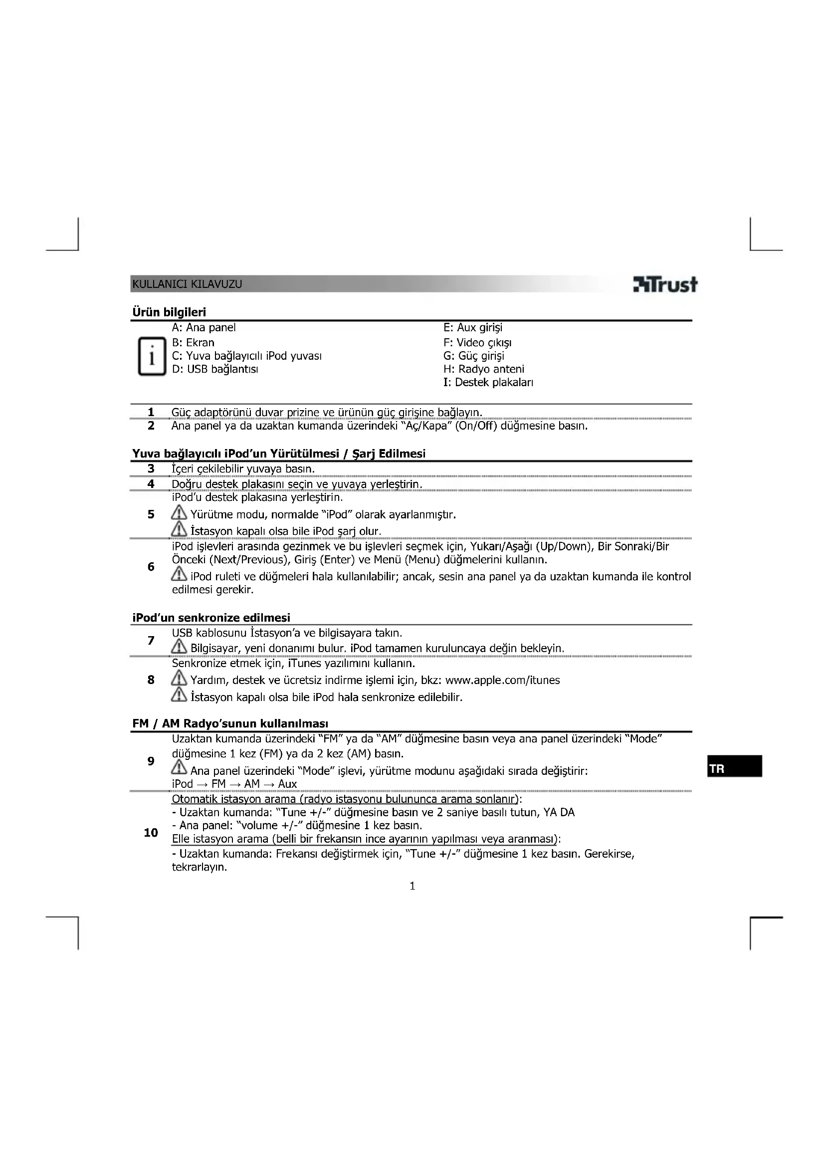 Ürün bilgileri A: Ana panel B: Ekran C: Yuva bağlayıcılı iPod yuvası D: USB bağlantısı E: Aux girişi F: Video çıkışı G: Güç girişi H: Radyo anteni I: Destek plakaları 1 Güç adaptörünü duvar prizine ve ürünün güç girişine bağlayın. 2 Ana panel ya da uzaktan kumanda üzerindeki “Aç/Kapa” (On/Off) düğmesine basın. Yuva bağlayıcılı iPod’un Yürütülmesi / Şarj Edilmesi 3 İçeri çekilebilir yuvaya basın. 4 Doğru destek plakasını seçin ve yuvaya yerleştirin.