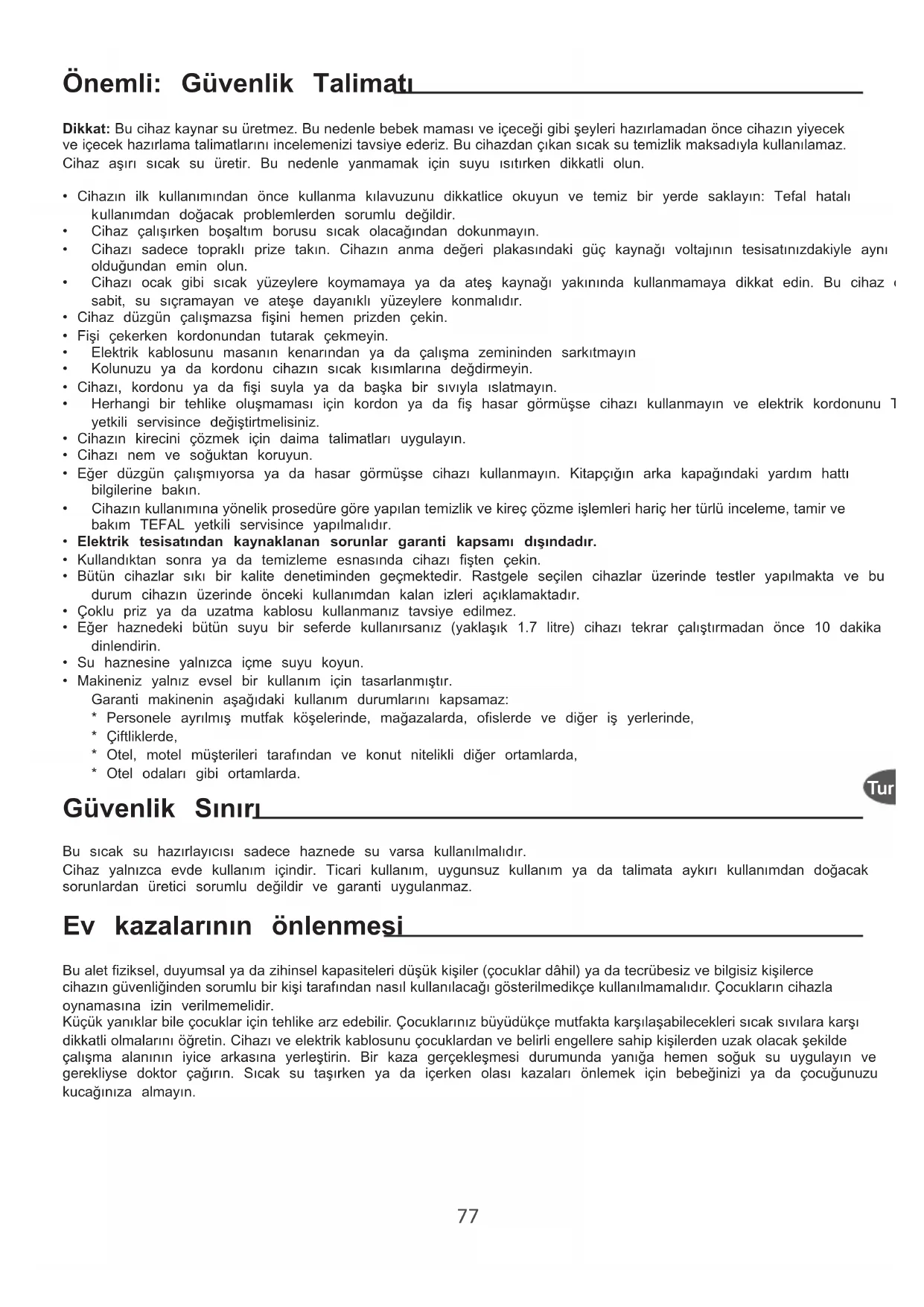 - Otel odaları gibi ortamlarda. Güvenlik Sınırı Bu sıcak su hazırlayıcısı sadece haznede su varsa kullanılmalıdır. Cihaz yalnızca evde kullanım içindir. Ticari kullanım, uygunsuz kullanım ya da talimata aykırı kullanımdan doğacak sorunlardan üretici sorumlu değildir ve garanti uygulanmaz. Ev kazalarının önlenmesi Bu alet fiziksel, duyumsal ya da zihinsel kapasiteleri düşük kişiler (çocuklar dâhil) ya da tecrübesiz ve bilgisiz kişilerce cihazın güvenliğinden sorumlu bir kişi tarafından nasıl kullanılacağı gösterilmedikçe kullanılmamalıdır. Çocukların cihazla oynamasına izin verilmemelidir. Küçük yanıklar bile çocuklar için tehlike arz edebilir. Çocuklarınız büyüdükçe mutfakta karşılaşabilecekleri sıcak sıvılara karşı dikkatli olmalarını öğretin. Cihazı ve elektrik kablosunu çocuklardan ve belirli engellere sahip kişilerden uzak olacak şekilde çalışma alanının iyice arkasına yerleştirin. Bir kaza gerçekleşmesi durumunda yanığa hemen soğuk su uygulayın ve gerekliyse doktor çağırın. Sıcak su taşırken ya da içerken olası kazaları önlemek için bebeğinizi ya da çocuğunuzu kucağınıza almayın.