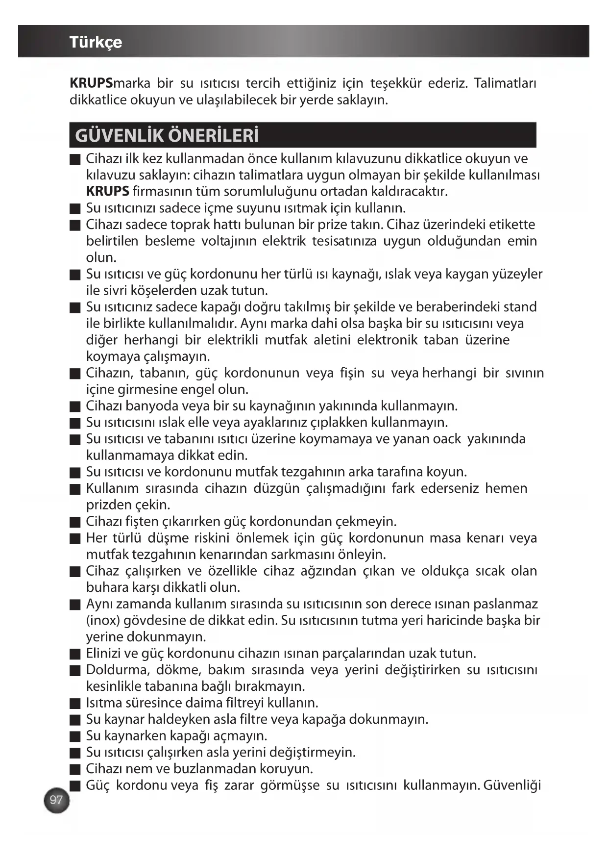 Cihazı ilk kez kullanmadan önce kullanım kılavuzunu dikkatlice okuyun ve kılavuzu saklayın: cihazın talimatlara uygun olmayan bir şekilde kullanılması KRUPS firmasının tüm sorumluluğunu ortadan kaldıracaktır.