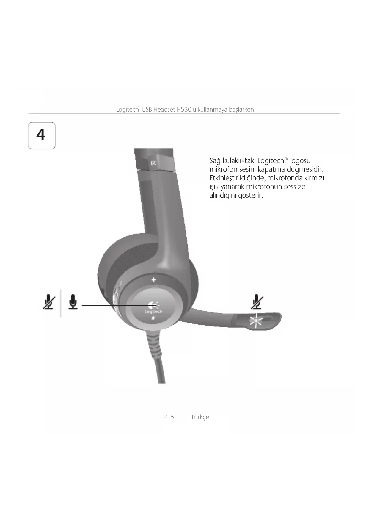 Sağ kulaklıktaki Logitech® logosu mikrofon sesini kapatma düğmesidir. Etkinleştirildiğinde, mikrofonda kırmızı ışık yanarak mikrofonun sessize alındığını gösterir.216 Türkçe Logitech