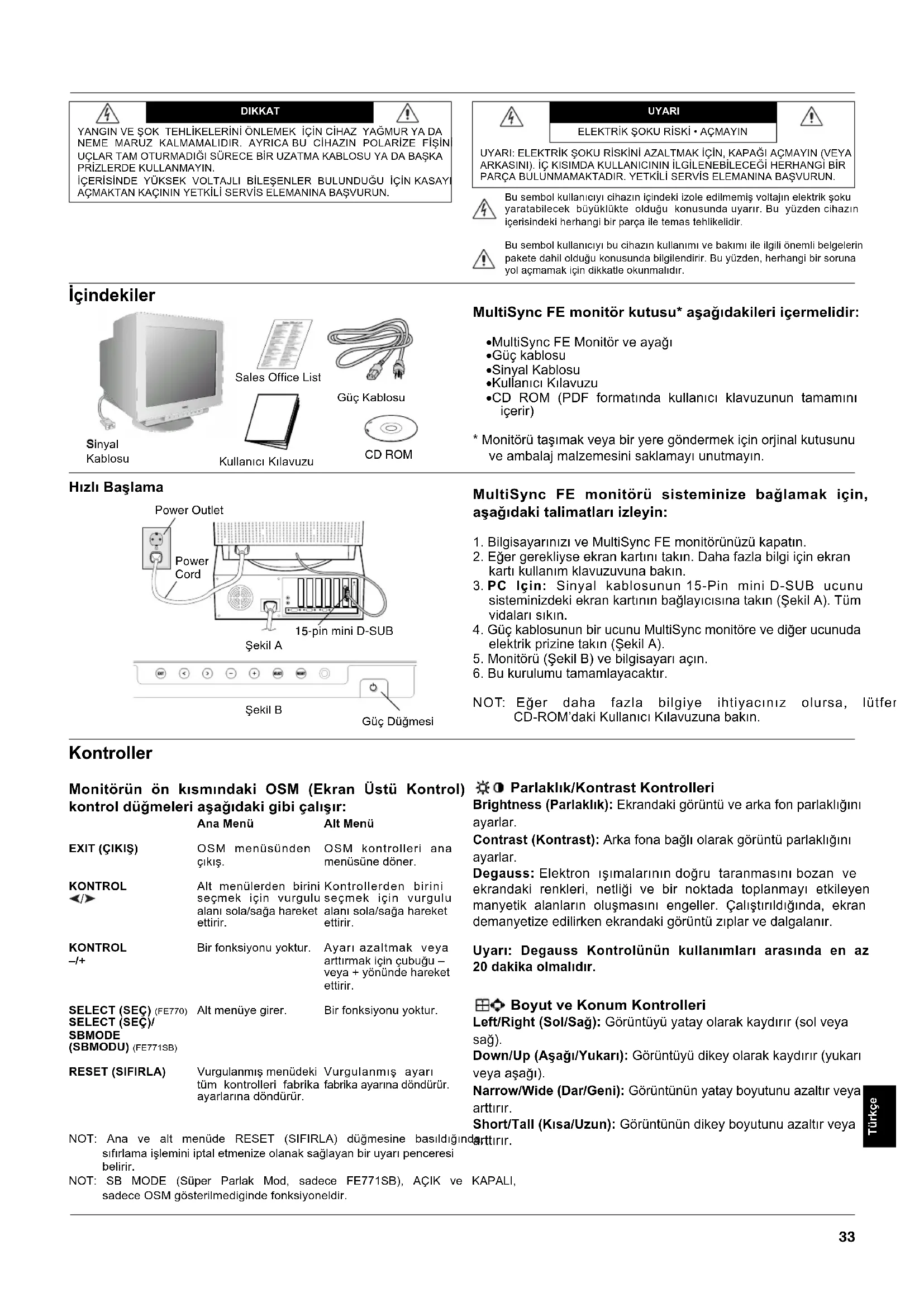 SELECT (SEÇ) (FE770) SELECT (SEÇ)/ SBMODE (SBMODU) (FE771SB) RESET (SIFIRLA) Ana Menü OSM menüsünden çýkýþ. Alt menülerden birini seçmek için vurgulu alaný sola/saða hareket ettirir. Bir fonksiyonu yoktur. Alt menüye girer. Vurgulanmýþ menüdeki tüm kontrolleri fabrika ayarlarýna döndürür. Alt Menü OSM kontrolleri ana menüsüne döner. Kontrollerden birini seçmek için vurgulu alaný sola/saða hareket ettirir. Ayarý azaltmak veya arttýrmak için çubuðu veya + yönünde hareket ettirir. Bir fonksiyonu yoktur. Vurgulanmýþ ayarý fabrika ayarýna döndürür. NOT: Ana ve alt menüde RESET (SIFIRLA) düðmesine basýldýðýnda, sýfýrlama iþlemini iptal etmenize olanak saðlayan bir uyarý penceresi belirir. NOT: SB MODE (Süper Parlak Mod, sadece FE771SB), AÇIK ve KAPALI, sadece OSM gösterilmediginde fonksiyoneldir. ELEKTRÝK ÞOKU RÝSKÝ AÇMAYIN Þekil A Þekil B Güç Düðmesi