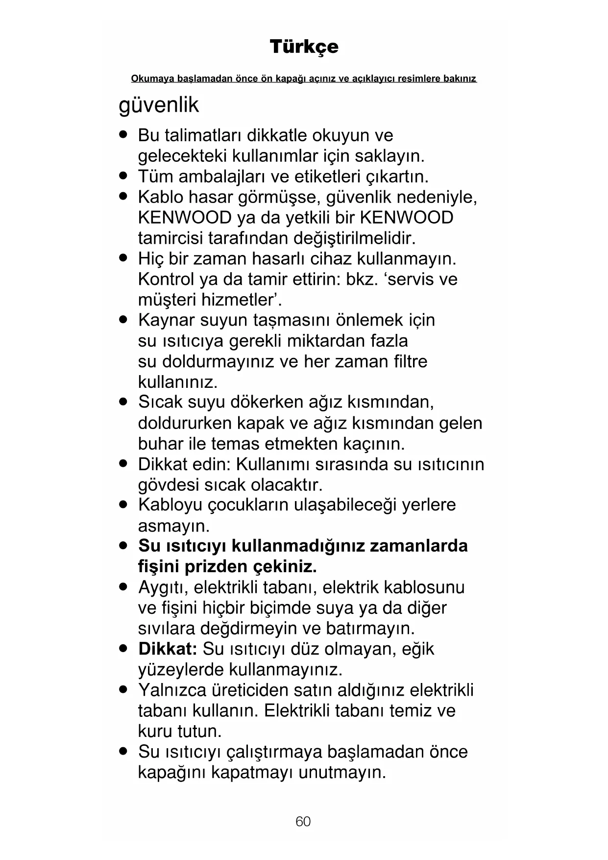 Su ısıtıcıyı çalıfltırmaya bafllamadan önce kapa¤ını kapatmayı unutmayın. Türkçe